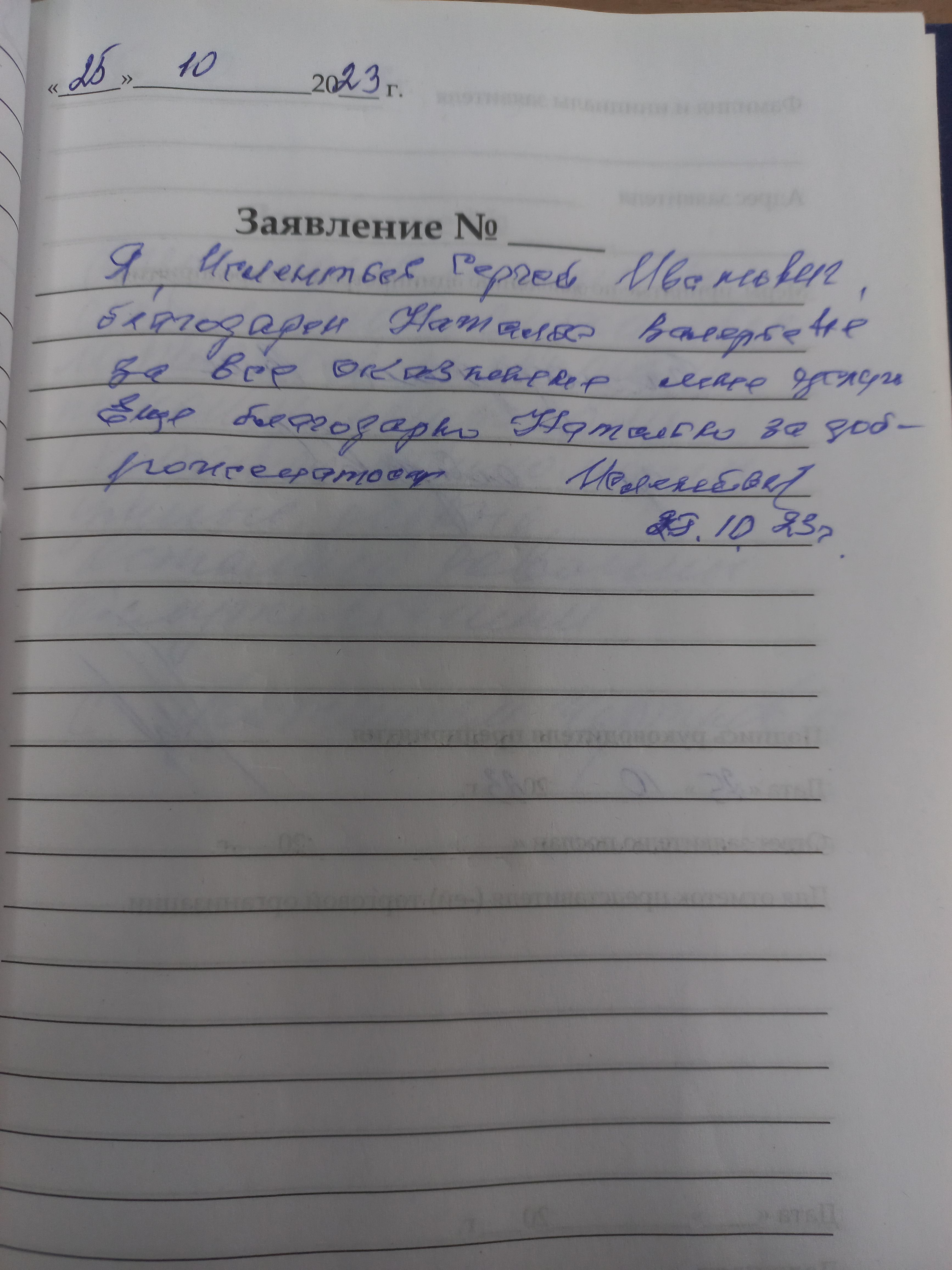 Я, Ислентьев Сергей Иванович, благодарен Наталье Валерьевне за все оказанные мне услуги . Еще благодарю Наталью за доброжелательность.