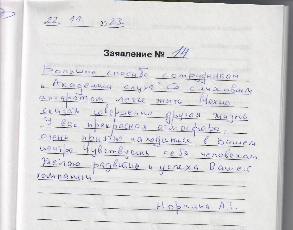 В Академию слуха меня направил врач, после чего я записалась и пришла на прием. Была проведена проверка слуха и мне подобрали слуховые аппараты, в которых я очень хорошо слышу. Выражаю благодарность всему коллективу центра за помощь решения моей проблемы. Внимательные, вежливые о очень знающие специалисты. От всей души желаю вам процветания, здоровья и успехов в работе. Низкий Вам поклон!