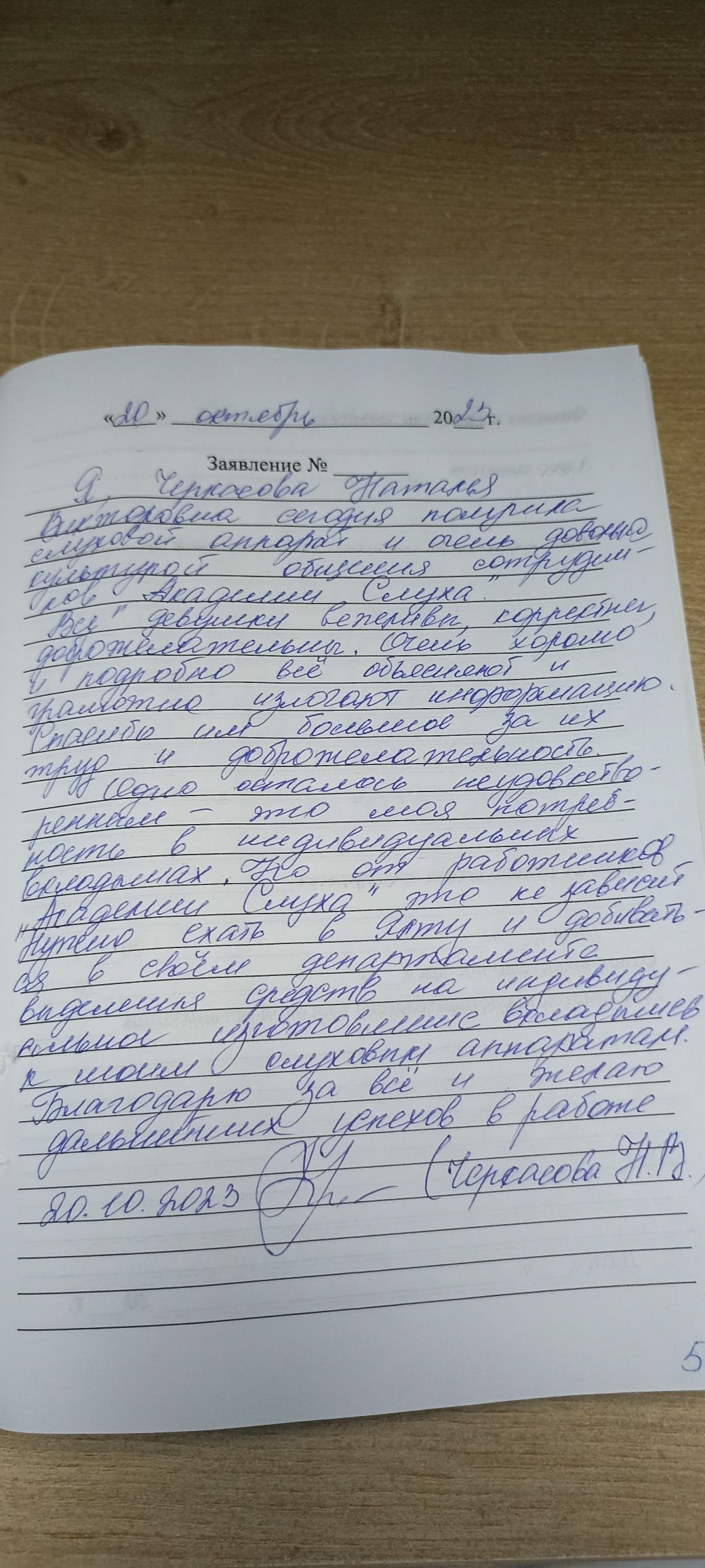 Я, Черкасова Наталья Викторовна сегодня получила слуховой аппарат и очень довольна культурой общения сотрудников "Академия Слуха"