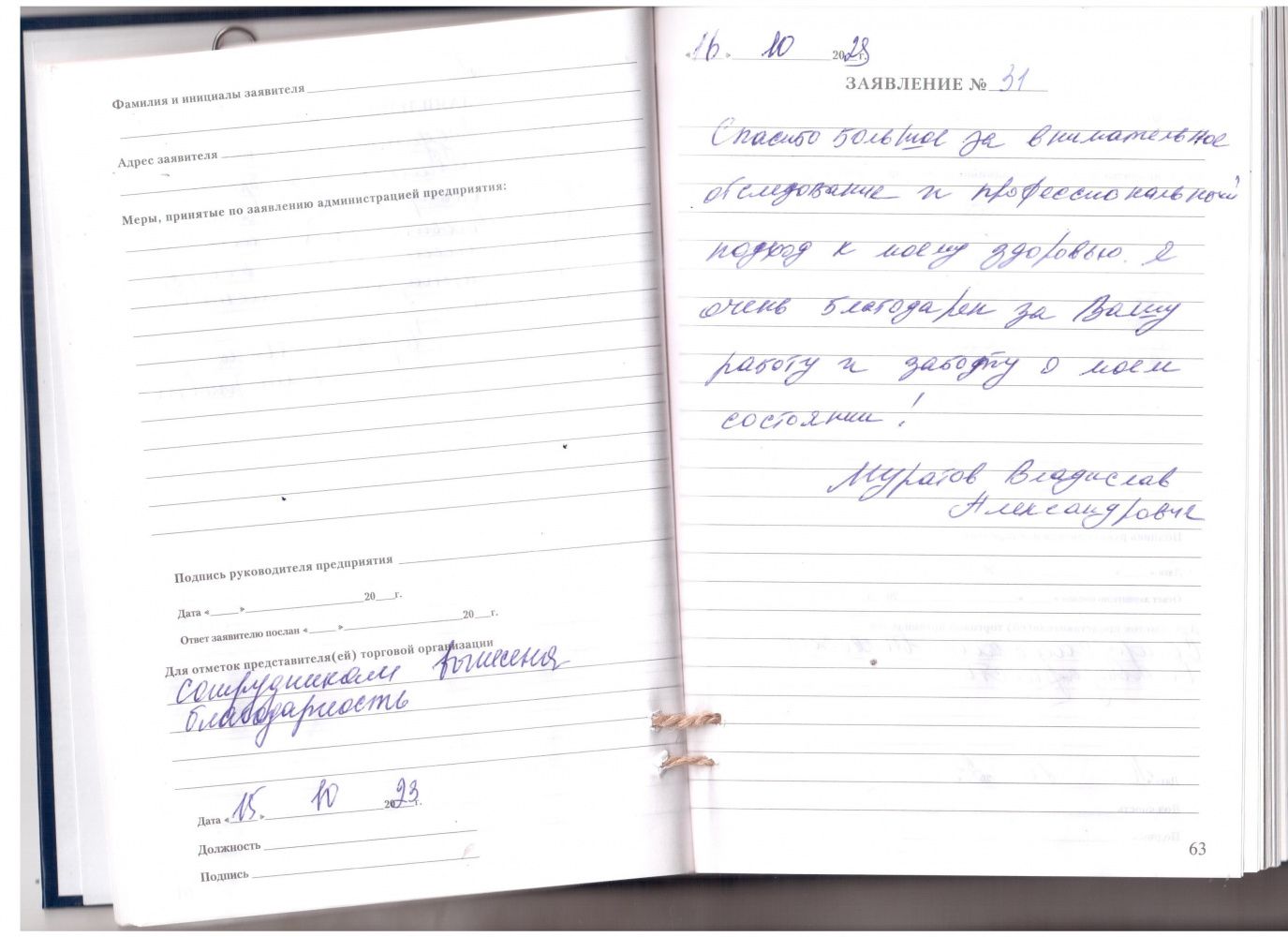 Спасибо большое за внимательное обследование и профессиональный подход к моему здоровью. Я очень благодарен за вашу работу и заботу о моем состоянии.