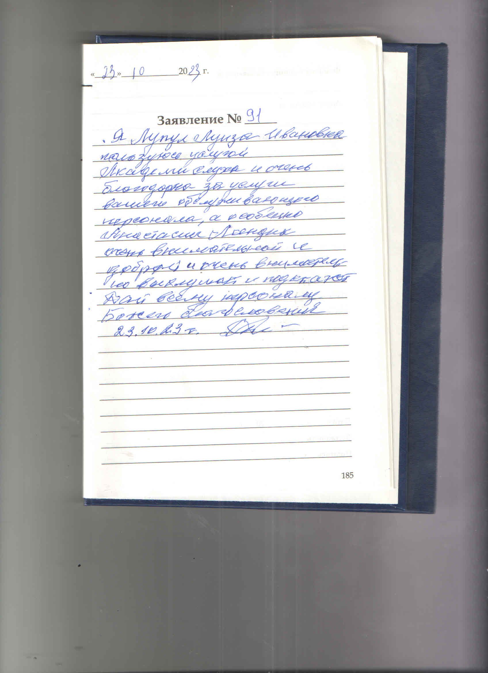 Я, Лупул Луиза Ивановна пользуюсь услугой Академии слуха и очень благодарна за услуги вашего обслуживающего персонала ,а особенно Ландик Анастасии. Очень внимательной и доброй и очень внимательно выслушает и подскажет. Дай всему персоналу Божьего благословения.23.10.23