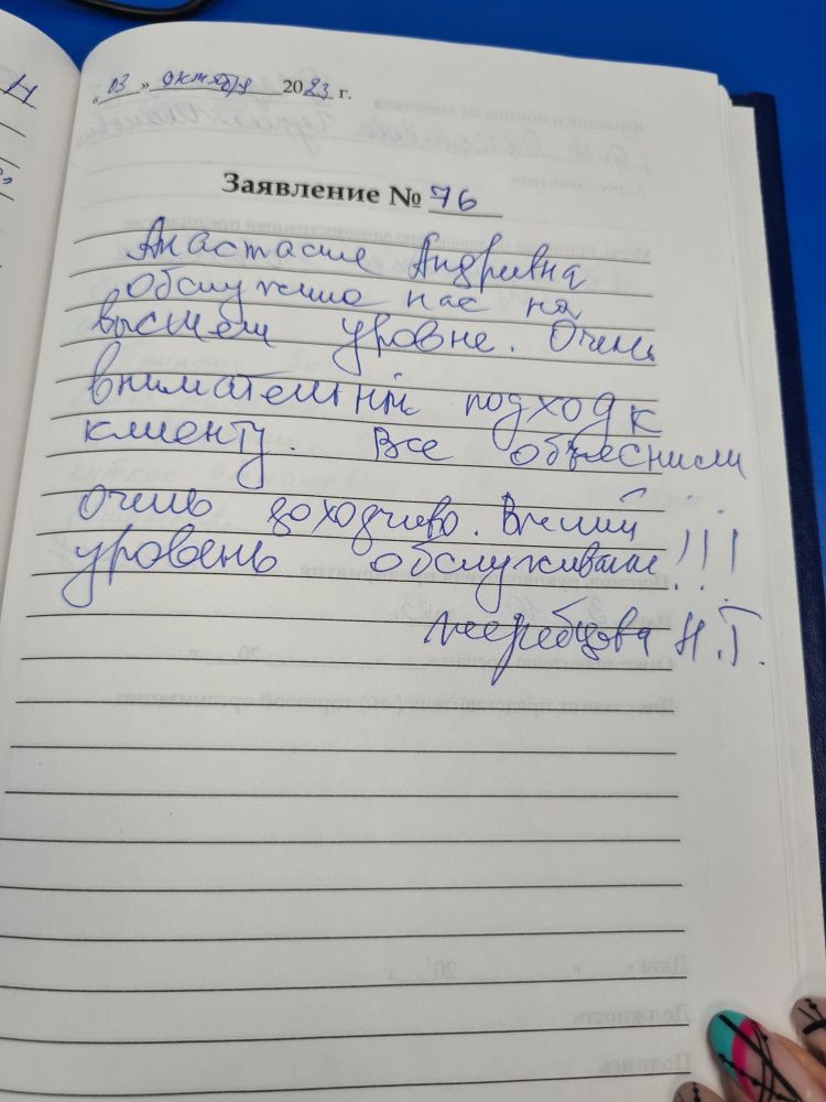 Анастасия Андреевна обслужила нас на высшем уровне. Очень внимательный подход к клиенту. Все объяснили очень доходчиво. Высший уровень обслуживания!!!