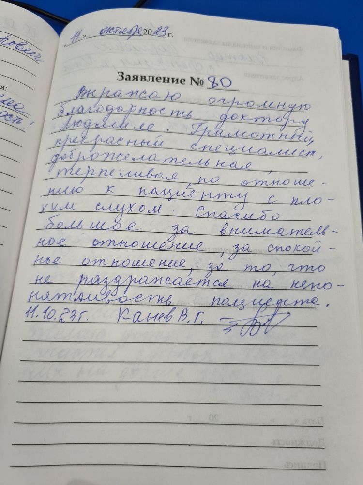 Выражаю огромную благодарность доктору Людмиле. Грамотный, прекрасный специалист, доброжелательная, терпеливая по отношению к пациенту с плохим слухом. Спасибо большое за внимательное отношение, за спокойное отношение, за то, что не раздражается на непонятливость пациента. 11.10.23 Канев ВГ