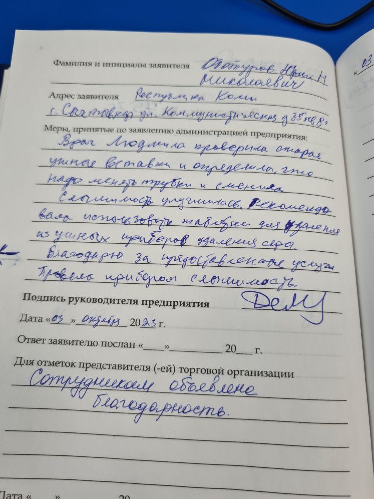 Врач Людмила проверила старые ушные вставки и определила что надо менять трубки и сменила слышимость улучшилась. Рекомендовала использовать таблетки для удаления из ушных приборов удаления серы. Благодарю за предоставленные услуги. Провела прибором слышимость.