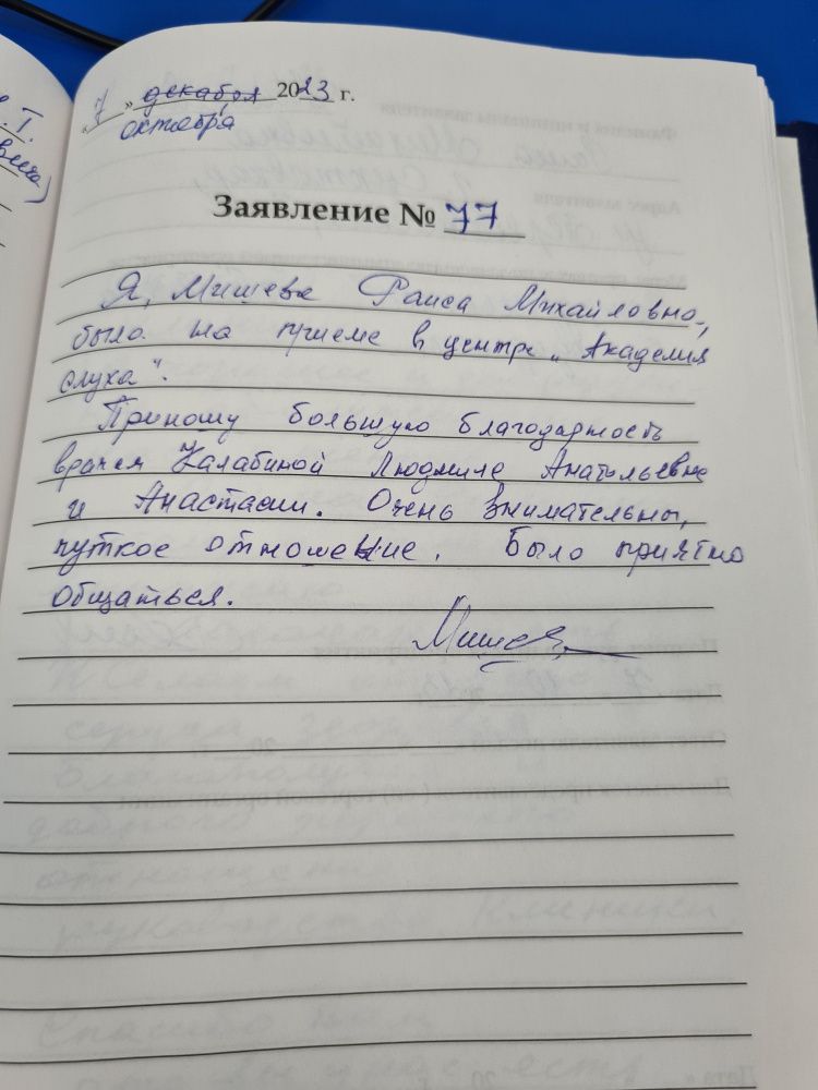 Я, Мишева Раиса Михайловна, была на приеме в центре "Академия слуха". Приношу большую благодарность врачам Калабиной Людмиле Анатольевне и Анастасии. Очень внимательны, чуткое отношение. Было приятно общаться
