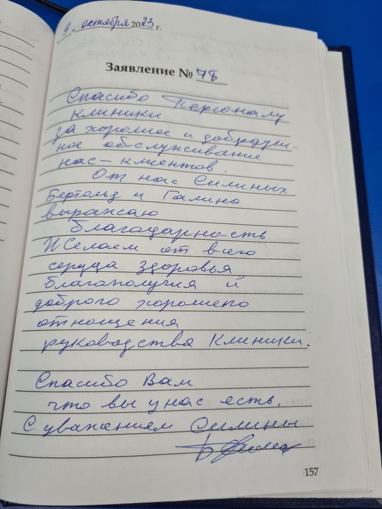 Спасибо персоналу клиники за хорошее и добродушное обслуживание нас-клиентов. От нас Силиных Бертольд и Галина выражаем благодарность и желаем от всего сердца здоровья, благополучия и доброго хорошего отношения руководства клиники. Спасибо Вам что вы у нас есть. С уважением Силины
