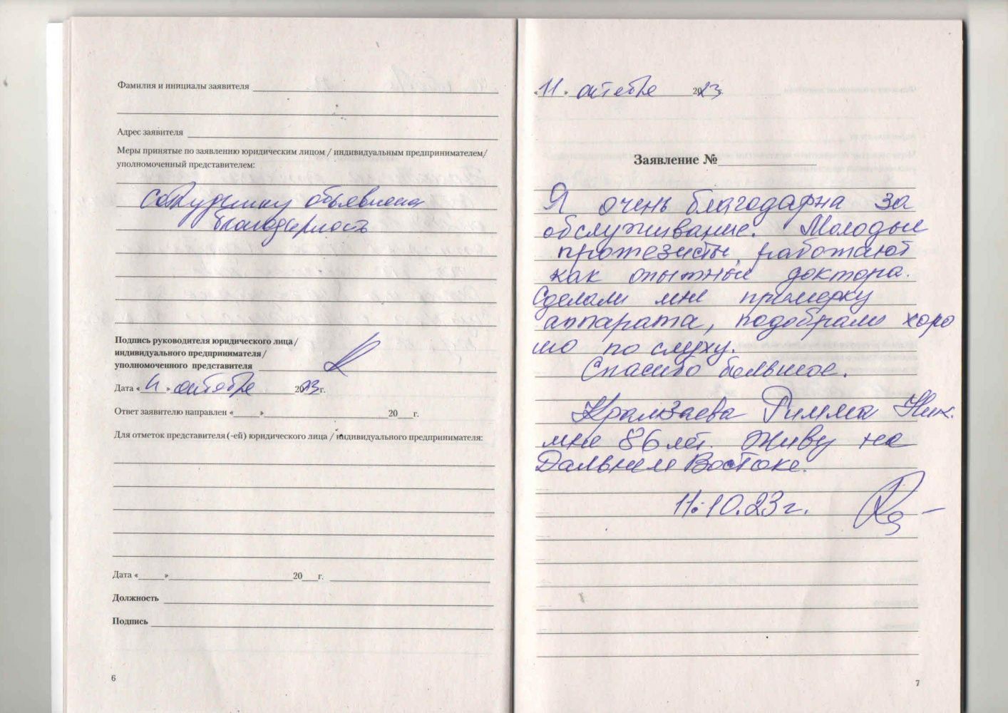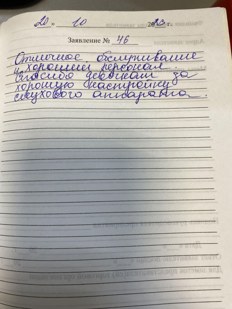 Я очень благодарна за обслуживание. Молодые протезисты работают как опытные доктора. Сделали мне примерку аппарата, подобрали хорошо по слуху. Спасибо большое.