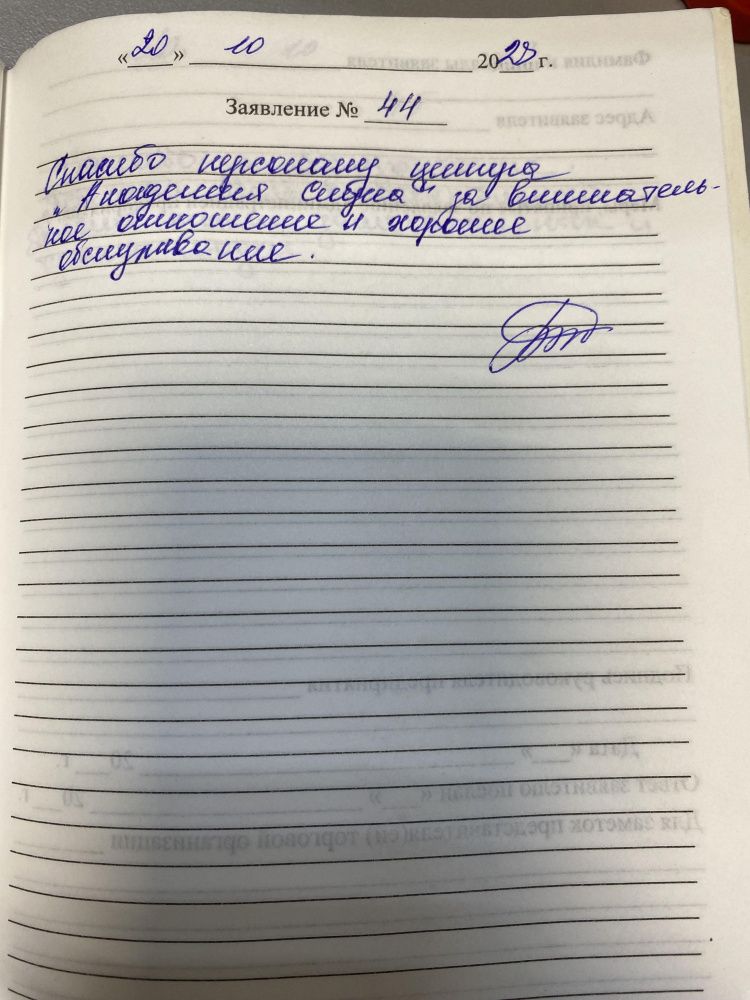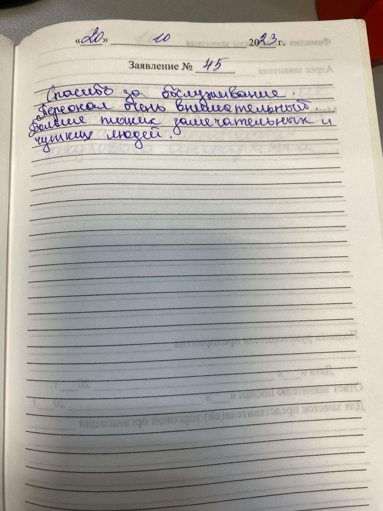 Спасибо зп обслуживание .Персонал очень внимательный .Побольше таких замечательных и чутких людей.