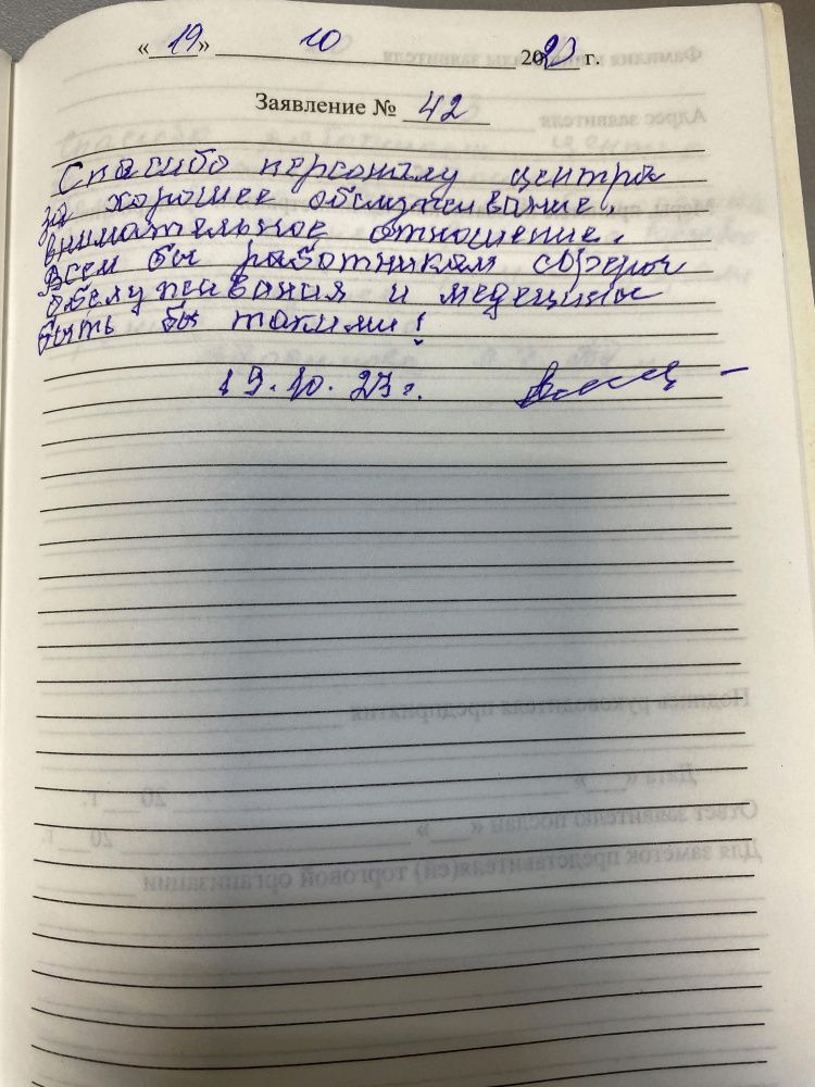 Спасибо персоналу центра за хорошее обслуживание, внимательное отношение . Всем бы работникам сферы обслуживания и медицины быть бы такими !