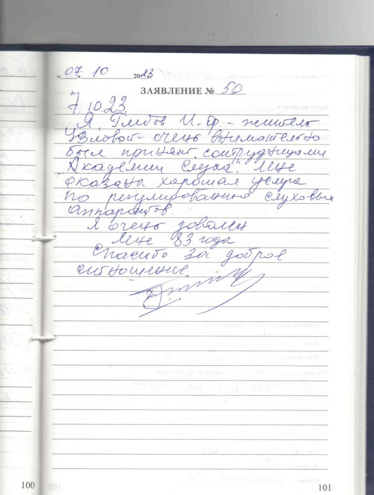 Я, Глебов Иван Федорович - житель Узловой - очень внимательно был принят сотрудницами "Академии слуха". Мне оказана хорошая услуга по регулированию слуховых аппаратов.