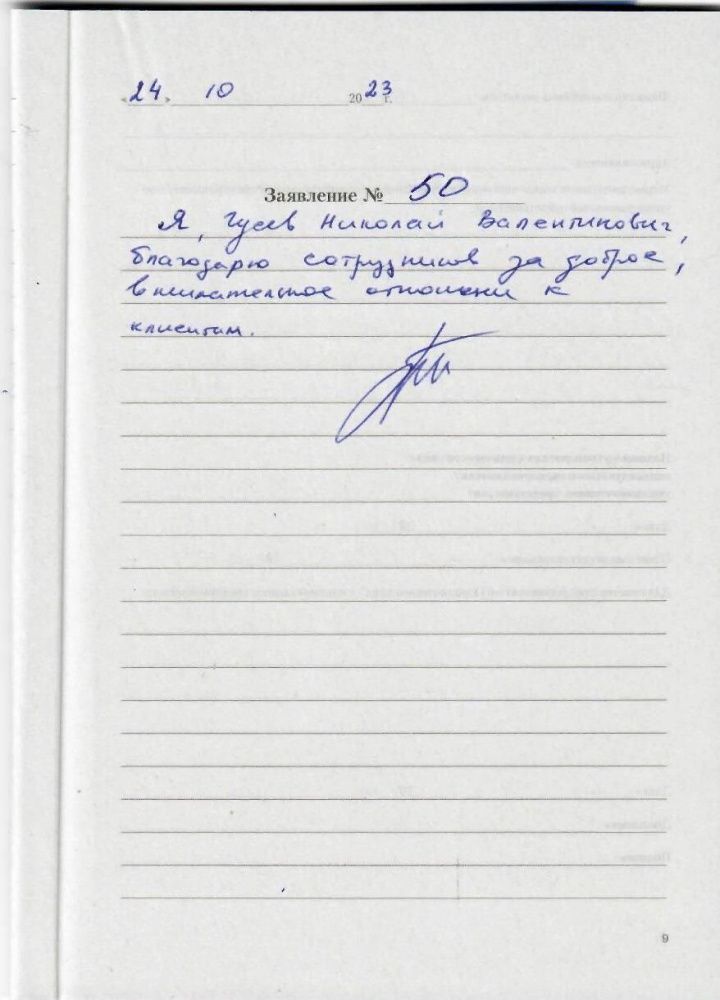 Я, Гусев Николай Валентинович, благодарю сотрудников за доброе, внимательное отношение к клиентам.