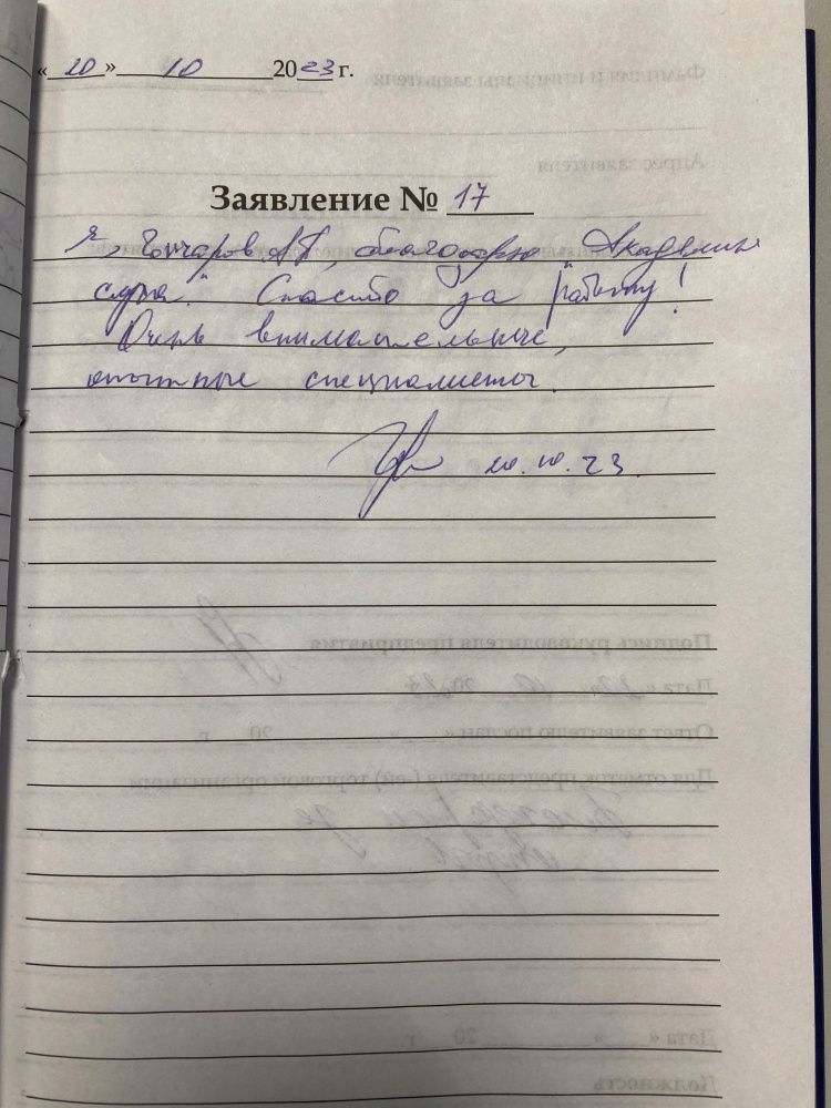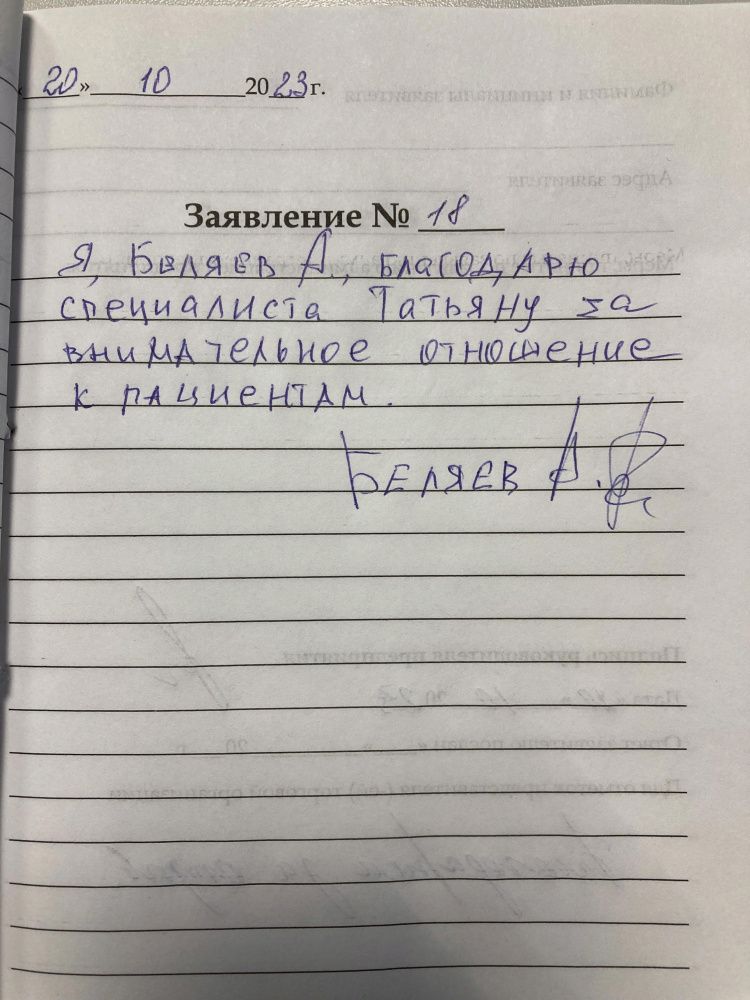 Я, Беляев А, благодарю специалиста Татьяну за внимательное отношение к пациентам.