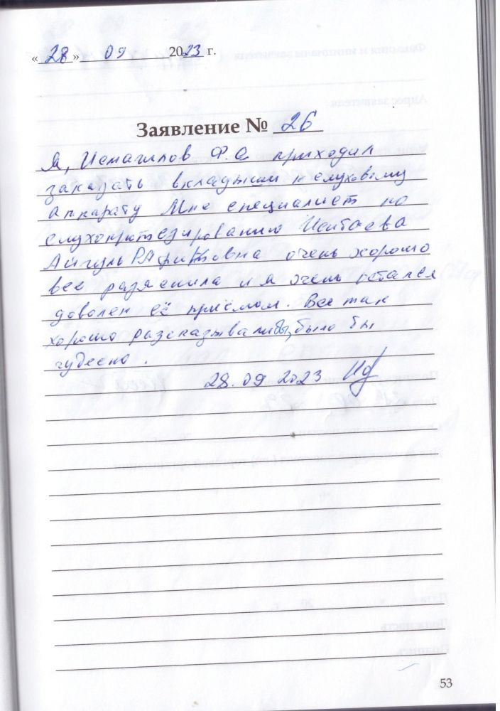 Я, Исмагилов Ф.Е. приходил заказать вкладыши к слуховому аппарату. Мне специалист по слухопротезированию Исибаева Айгуль Рафековна хорошо все разъяснила и очень остался доволен её приёмом. Все так хорошо рассказывали бы, было бы чудесно