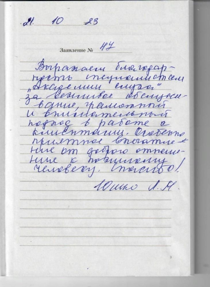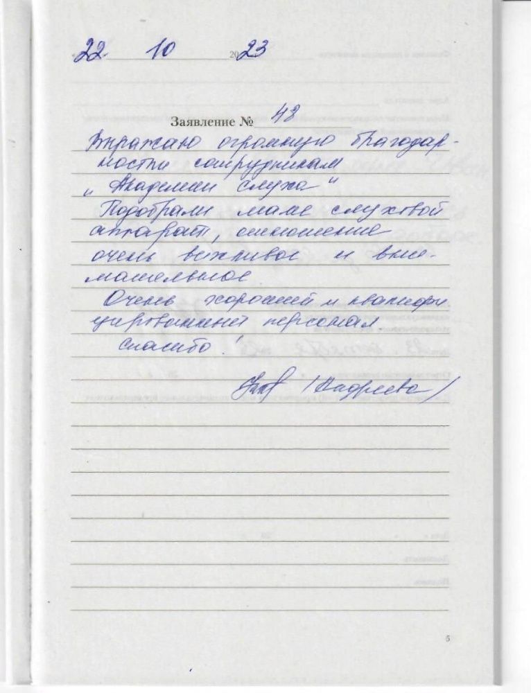 Выражаем благодарность специалистам "Академии слуха" за вежливое обслуживание, грамотный и внимательный подход в работе с клиентами. Особенно приятное впечатление от доброго отношения к пожилому человеку. Спасибо!