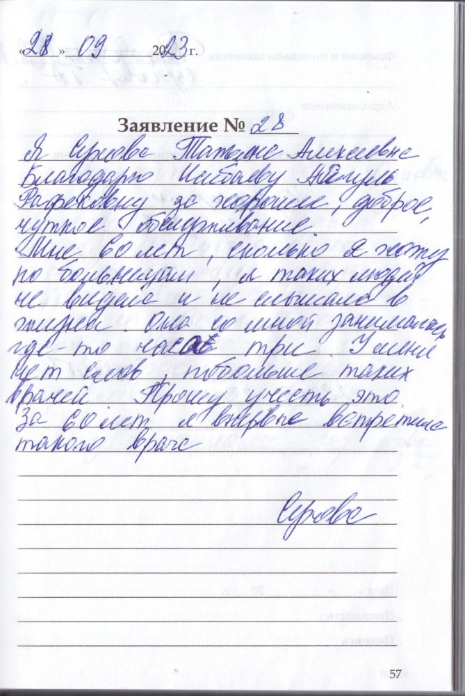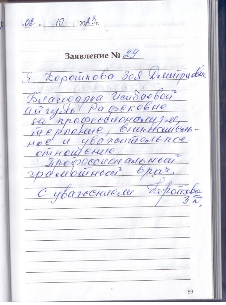Я, Короткова Зоя Дмитриевна, благодарна Исибаевой Айгуль Рафековне за профессионализм, терпение, внимательное и уважительное настроение. Профессиональный грамотный врач