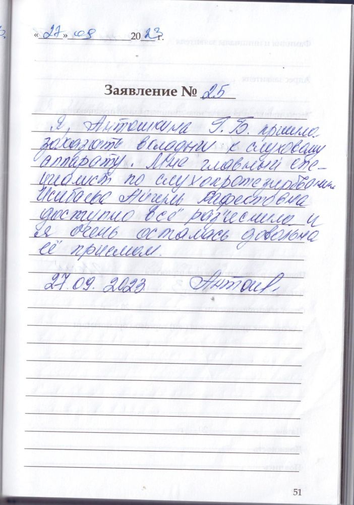 Я, Антошкина Г.Б. пришла заказать вкладыши к слуховому аппарату. Мне главный специалист по слухопротезированию Исибаева Айгуль Рафековна доступно все разъяснила и очень осталась довольна её приемом.