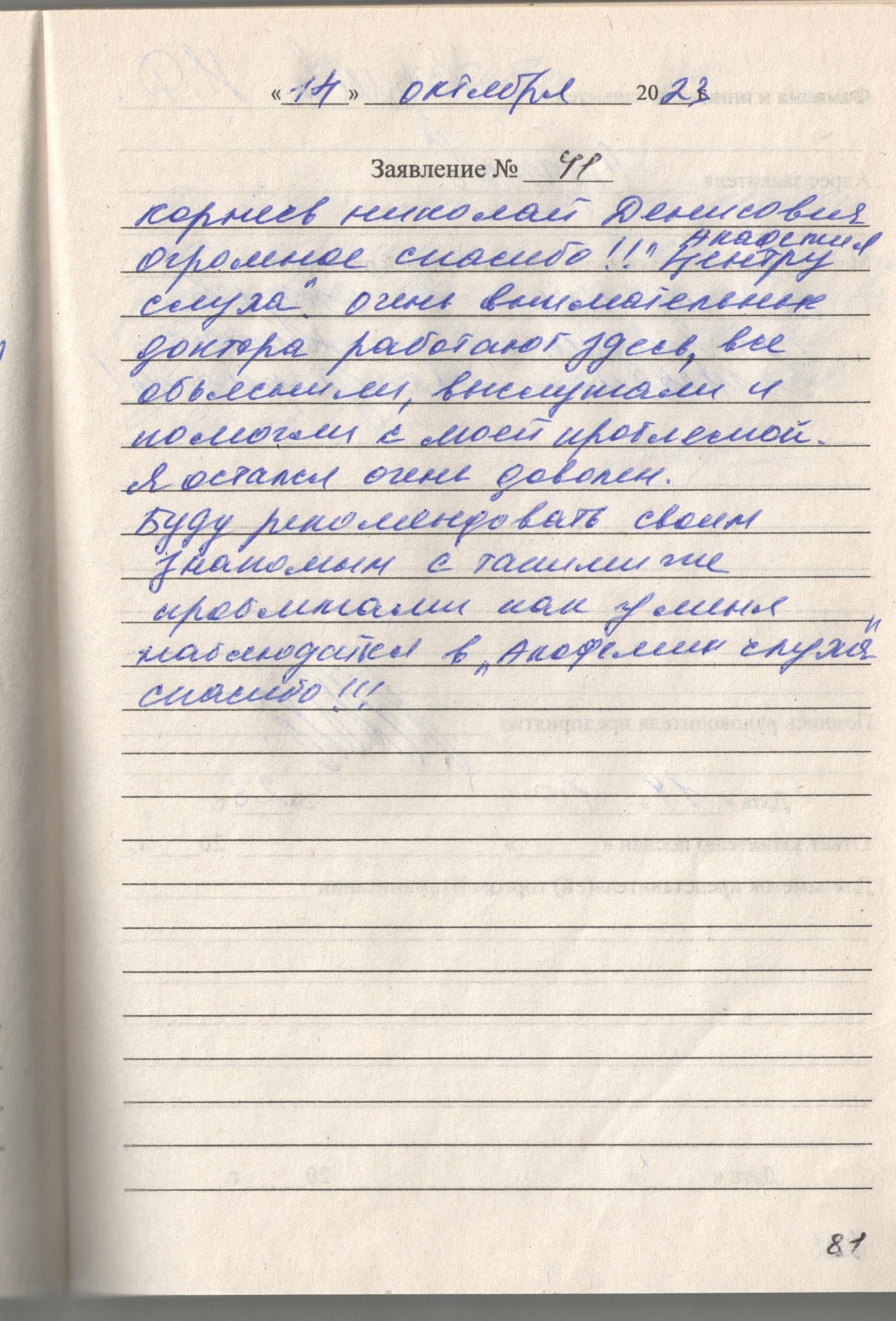 Огромное спасибо центру "Академия Слуха". Очень внимательные доктора работают здесь, все объяснили, выслушали и помогли с моей проблемой. Я остался очень доволен. Буду рекомендовать своим знакомым с такими же проблемами как у меня наблюдаться в "Академии Слуха" спасибо !!!