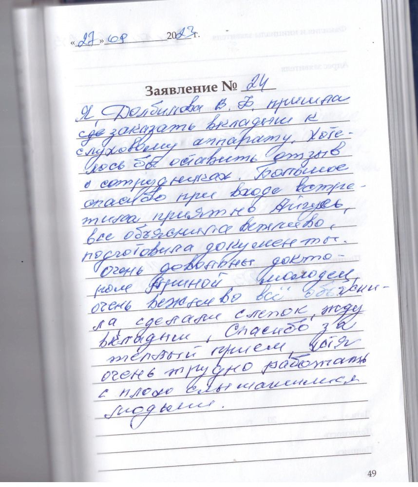 Я, долбилова В.Ф., пришла заказать вкладыши к слуховому аппарату.Хотелось бы оставить отзыв о сотрудниках. На входе встретила приятно Айгуль, все объяснила вежливо, подготовила документы. Очень довольны доктором Ариной-молодец!Очень вежливо всё объяснила, сделали слепок, жду вкладыши. Спасибо за теплый приём, хотя очень трудно работать с плохослышащими людьми