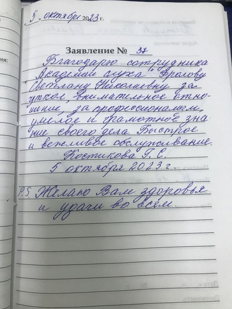 Мне, Спирину А.Д. в Академии слуха выполнено изготовление "ушного вкладыша". Специалисты Академии с большим вниманием отнеслись к моему заболеванию и прекрасно исполнили просьбу. спасибо им за помощь инвалиду. 27.09.2023 А.Д.Спирин