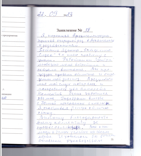 Я, коренная Архангелогородка , приехав очередной раз в Архангельск к родственникам. Посетила центр "Академия Слуха" так как имею проблему с ушами. Работники центра любезно меня встретили и оказали внимание. Все процедуры провели отлично и определили мой диагноз. в результате мой слух потерян и понадобилось два аппарата. Коллектив очень заботился обо мне. Подобрали вместе с Юлией прекрасные аппараты. Я, счастливая, теперь отлично слышу. Выношу благодарность всему коллективу за профессионализм. Все они люди в белых халатах на своем месте. И хотелось бы, чтобы были отмечены руководством. Белоусова З.И. жительница города Туапсе.