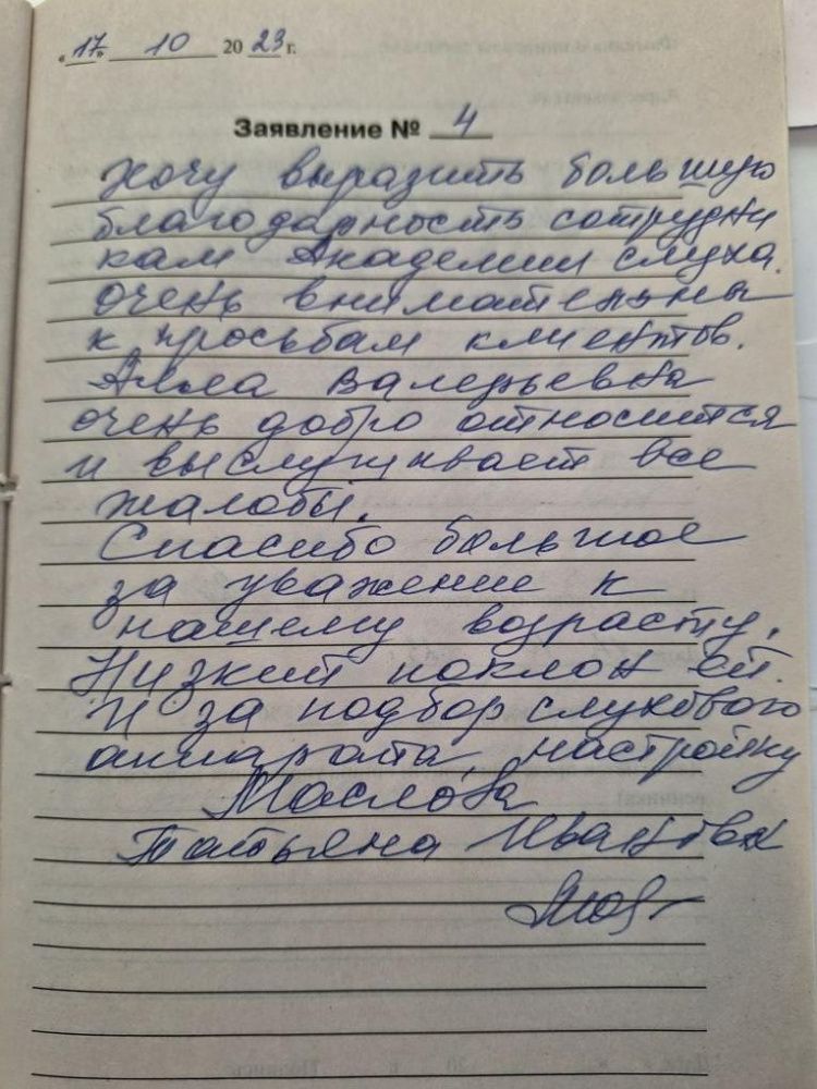 Я, Кубышкина Людмила Григорьевна, хочу выразить огромную благодарность. Всем сотрудникам Академии слуха благодарность за их отношение к клиентам, вежливость, внимательность, проявление сочувствия. Всегда помогут, окажут помощь, подскажут.