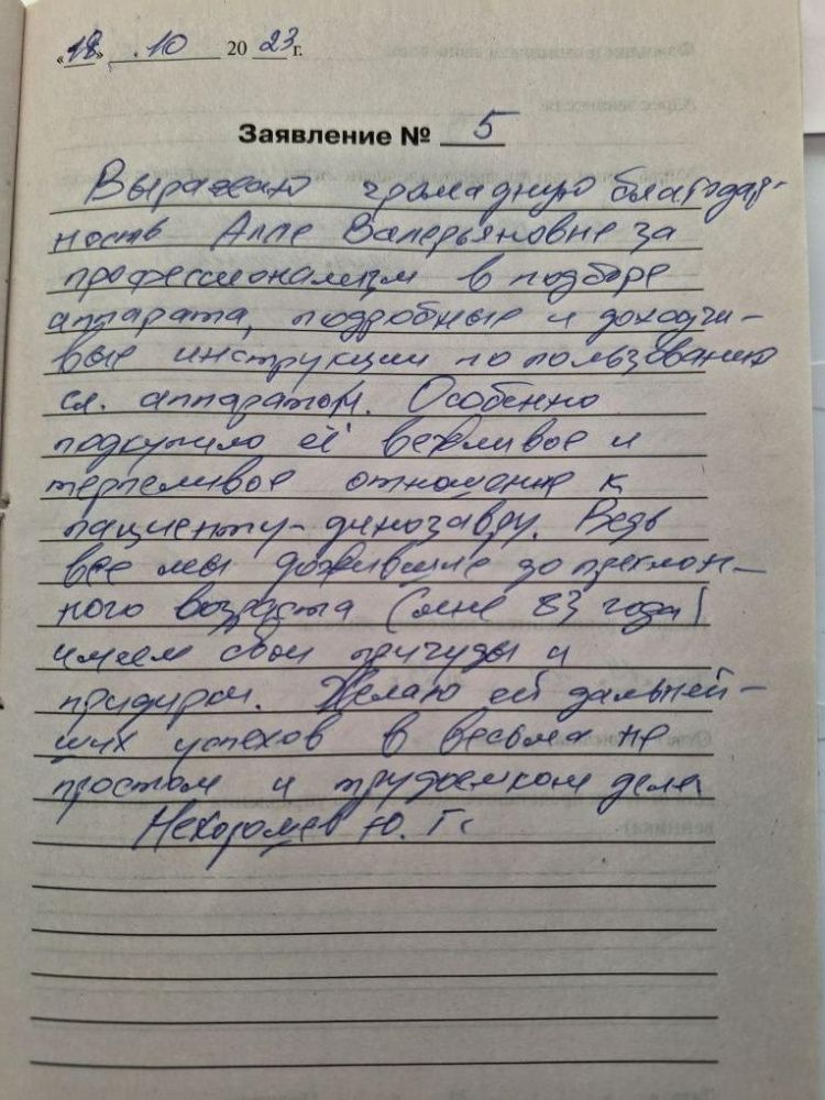 Выражаю громадную благодарность Алле Валерьевне за профессионализм в подборе аппарата. Особенно подкупило вежливое и терпеливое отношение к пациенту-динозавру. Ведь все мы дожившие до преклонного возраста имеем свои причуды и придирки. Желаю ей дальнейших успехов в весьма не простом и трудоемком деле. Нехорошев Ю.Г.