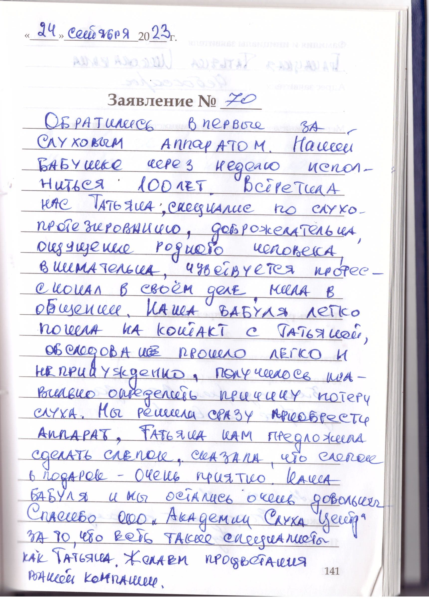 Обратились впервые за слуховым аппаратом. Нашей бабушке через неделю исполнится 100 лет. Встретила нас Татьяна, специалист по слухопротезированию, доброжелательна, общение родного человека, внимательна, чувствуется профессионал в своем деле, мила в общении. Наша бабуля легко пошла на контакт с Татьяной, обследование прошло легко и непринужденно, получилось правильно определить причину потери слуха. Мы решили сразу приобрести аппарат. Татьяна нам предложила сделать слепок, сказала, слепок в подарок – очень приятно. Наша бабуля и мы остались очень довольны. Спасибо ООО «Академии слуха Центр» за то, что есть такие специалисты как Татьяна. Желаем процветания вашей компании.