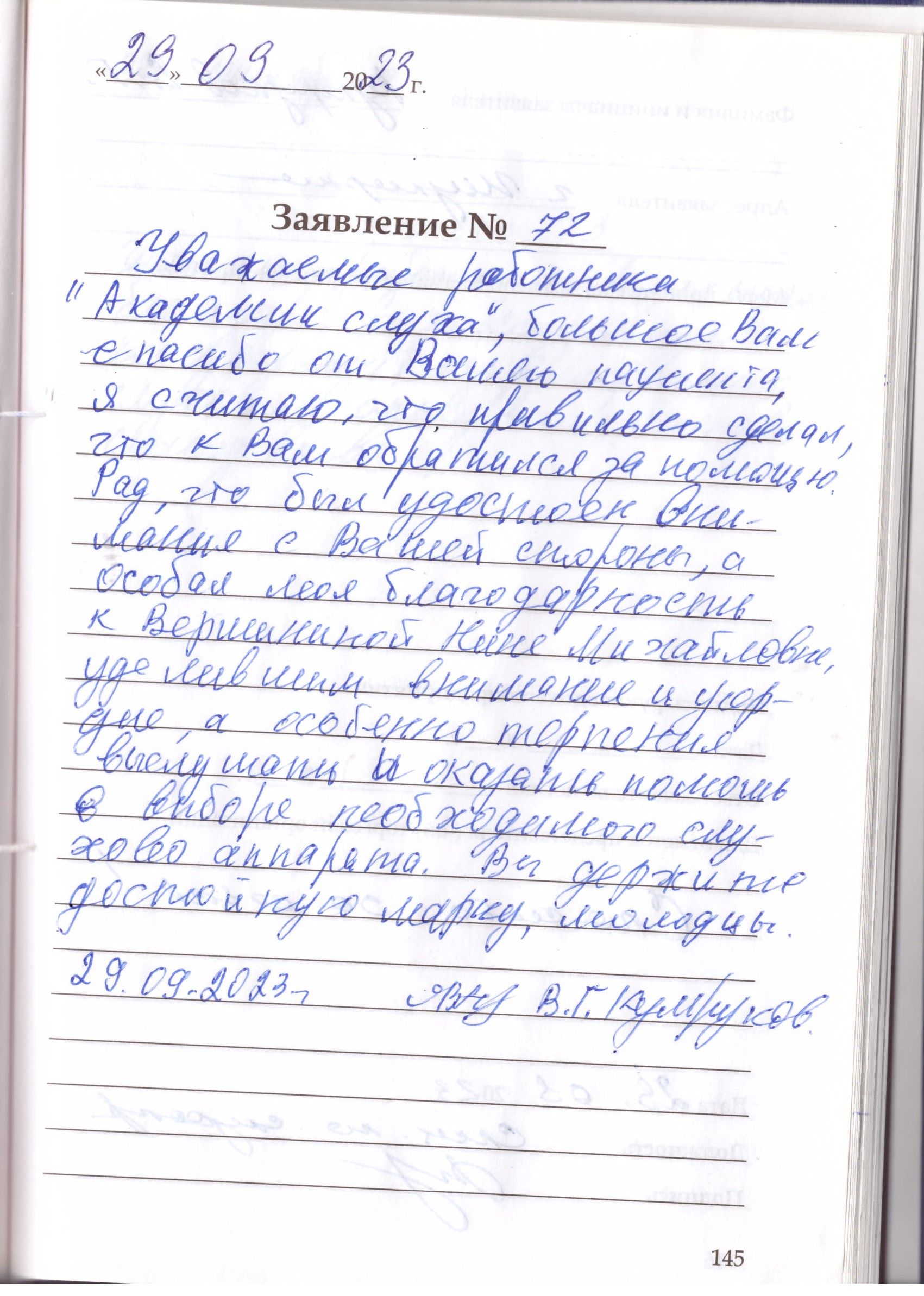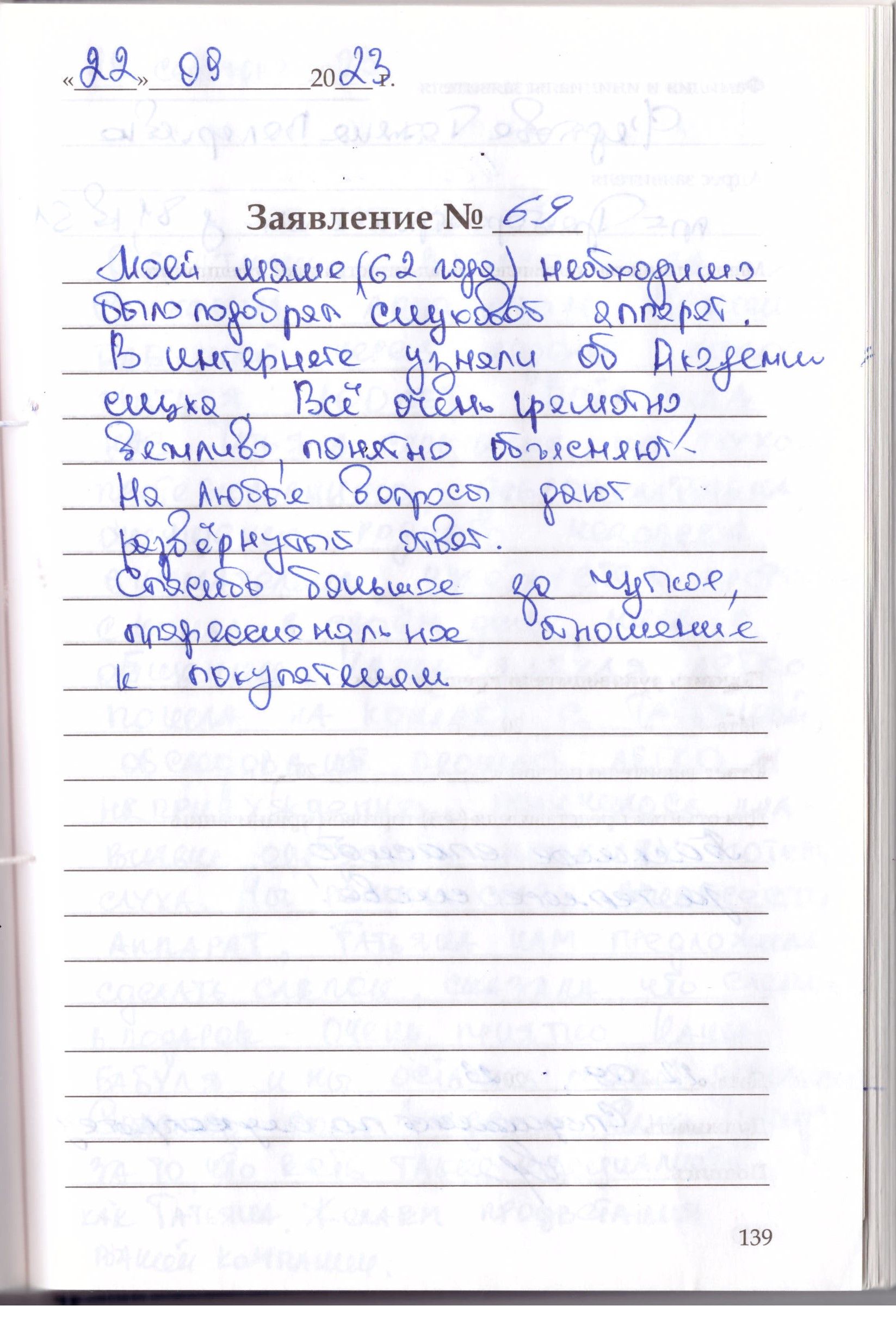 Уважаемые работники «Академии слуха», большое Вам спасибо от Вашего пациента. Я считаю, что правильно сделал, что к Вам обратился за помощью. Рад, что был удостоен внимания с Вашей стороны, а особая моя благодарность к Вершининой Нине Михайловне, уделившей внимание и усердие, а особенно терпение выслушать и оказать помощь в выборе необходимого слухового аппарата. Вы держите достойную марку, молодцы.