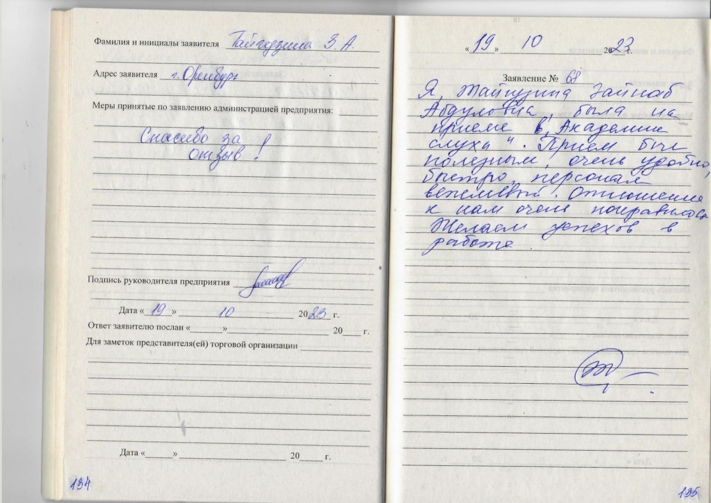 Я, Тайгузина Зайнаб Абдуловна, была на приеме в "Академии слуха". Прием был полезным, очень удобно, быстро. Персонал вежливый. Отношение к нам очень понравилось. Желаем успехов в работе.