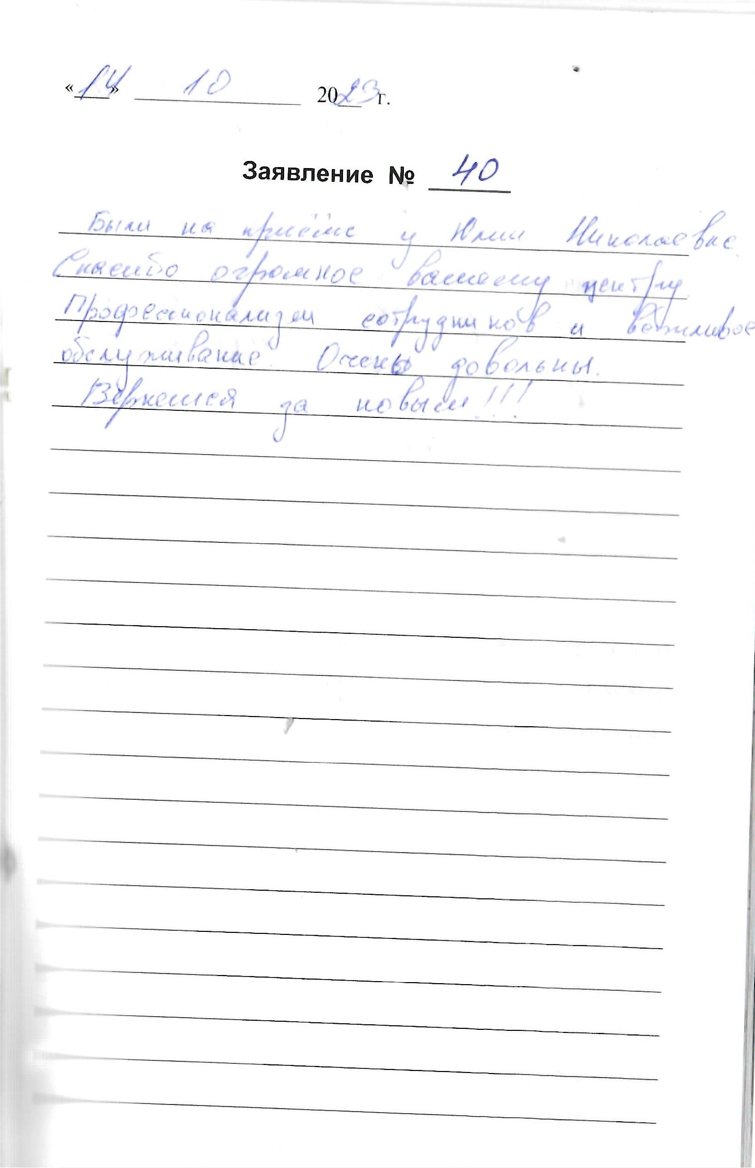 Были на приеме у Юлии Николаевны. Спасибо огромное Вашему центру. Профессионализм сотрудников и вежливое обслуживание. Очень довольны. Вернемся за новым!!!