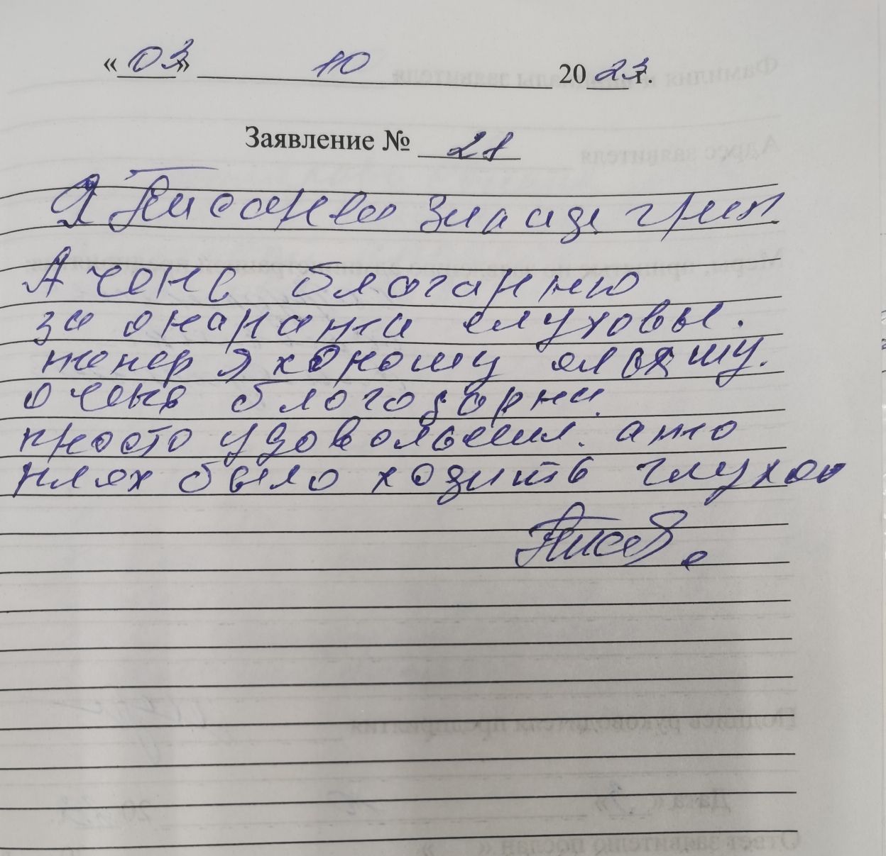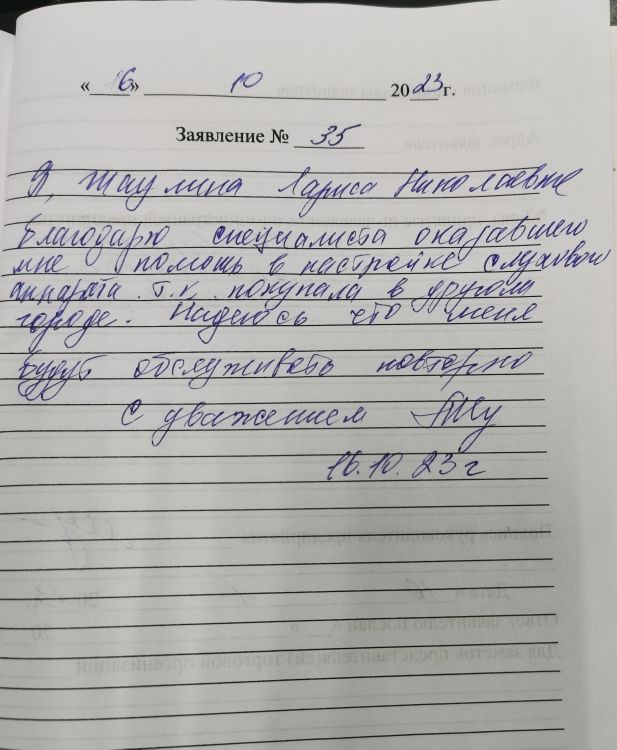 Я Шаулина Лариса Николаевна, благодарю специалиста, оказавшего мне помощь в настройке слухового аппарата, т.к. покупала в другом городе. Надеюсь, что меня будут обслуживать повторно. С уважением. 16.10.23