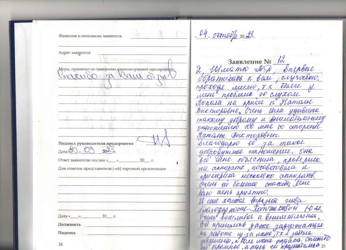 Я, Шматко Т.Д. впервые обратилась к вам, случайно, проходя мимо, т.к. были у меня проблемы со слухом. попала на прием к Наталье Викторовне. Очень была удивлена такому доброму и внимательному отношению ко мне со стороны Натальи Викторовны. Благодарю ее за такое добродушное отношение. Она все мне объяснила, проверила на аппарате, посоветовала к примерке несколько аппаратов, очень ей большое спасибо. Мне было очень приятно. А еще хочется выразить слова благодарности Хотченковой Юле, очень вежливая и внимательная. Ей пришлось даже задержаться на работе из за меня, т.к. забыла документы и юля меня ждала. Спасибо ей огромное, я очень ей признательна.