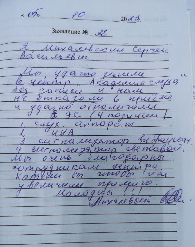 Я, Михалевский Сергей Васильевич. Мы удачно зашли в центр «Академии Слуха» без записи и нам не отказали в приеме и удачно обналичили ЭС (электронный сертификат) (4 позиции):