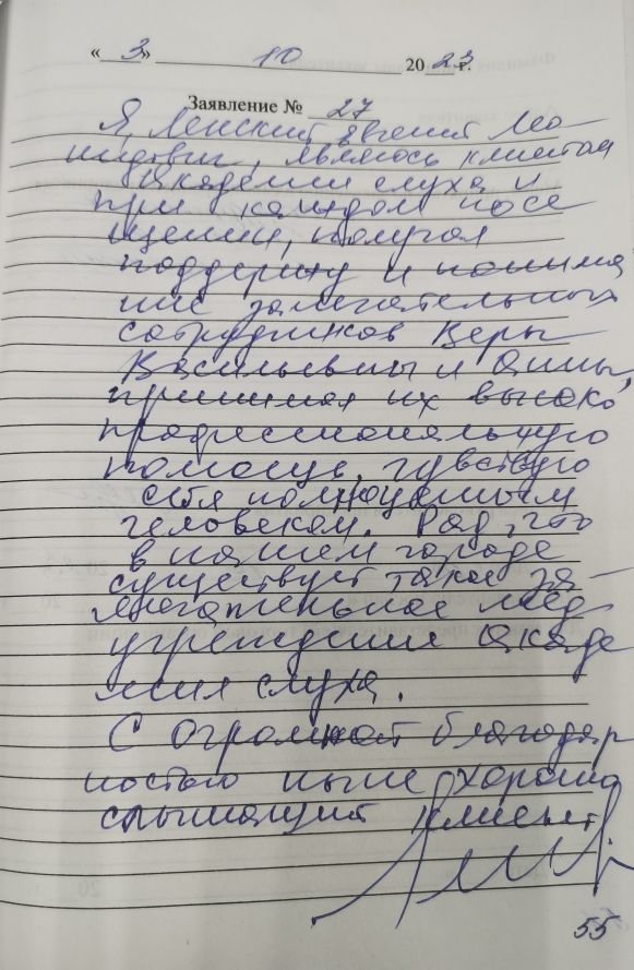Я, Ленский Евгений Леонидович, являюсь клиентом «Академии Слуха» и при каждом посещении получал поддержку и понимание замечательных сотрудников Вера Васильевна и Анны, принимая их высокопрофессиональную помощь, чувствую себя полноценным человеком. Рад, что в нашем городе существует такое замечательное учреждение «Академия Слуха». С огромной благодарностью, ныне хорошо слышащий клиент.