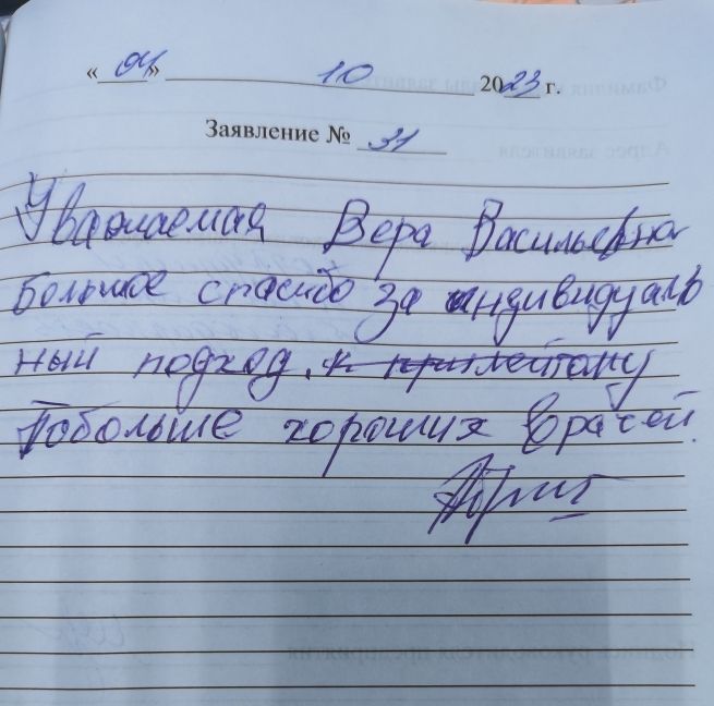 Уважаемая Вера Васильевна, большое спасибо за индивидуальный подход. Побольше хороших врачей.