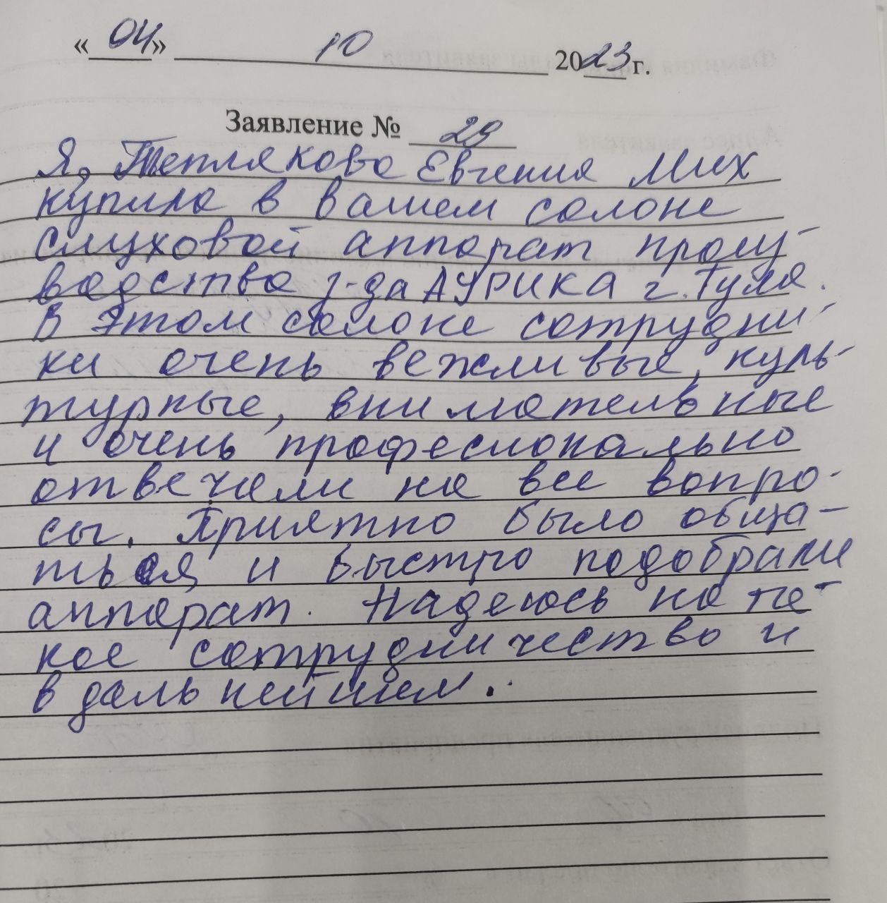 Я, Теплякова Евгения Михайловна, купила в вашем салоне слуховой аппарат производства завода Аурика г. Тула. В этом салоне сотрудники очень вежливы, культурны, внимательные и очень профессионально отвечали на все вопросы. Приятно было общаться и быстро подобрали аппарат. Надеюсь, на такое сотрудничество и в дальнейшем.