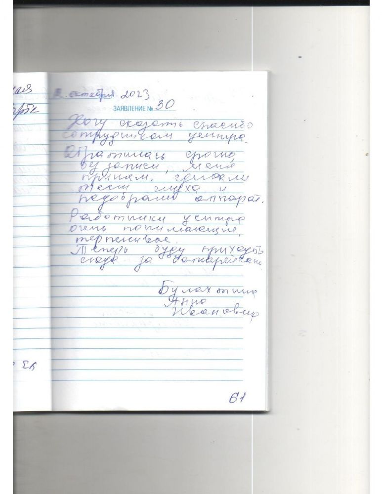Хочу сказать спасибо сотрудникам центра. Обратилась срочно, без записи, меня приняли, сделали тест слуха и подобрали аппарат. Работники центра очень понимающие и терпеливые. Теперь буду приходить сюда за батарейками.