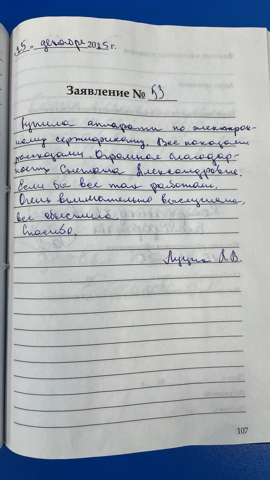 Заявление № 53 Купила аппараты по электронному сертификату. Всё показали, рассказали. Огоромная благодарность Снежане Александровне. Если бы все так работали. Очень внимательно выслушала, все объяснила. Спасибо. 25.12.2025 г. Луцик Л.В.