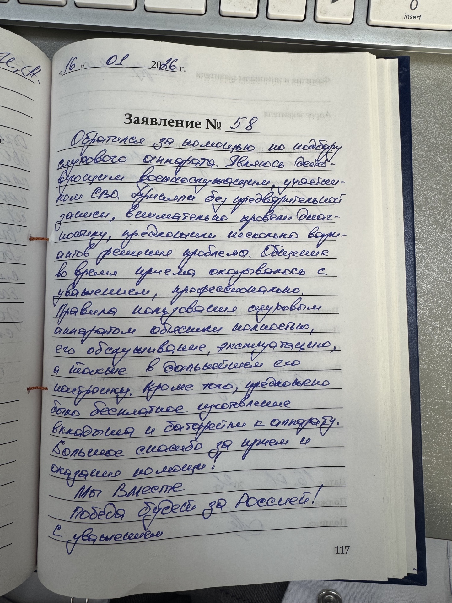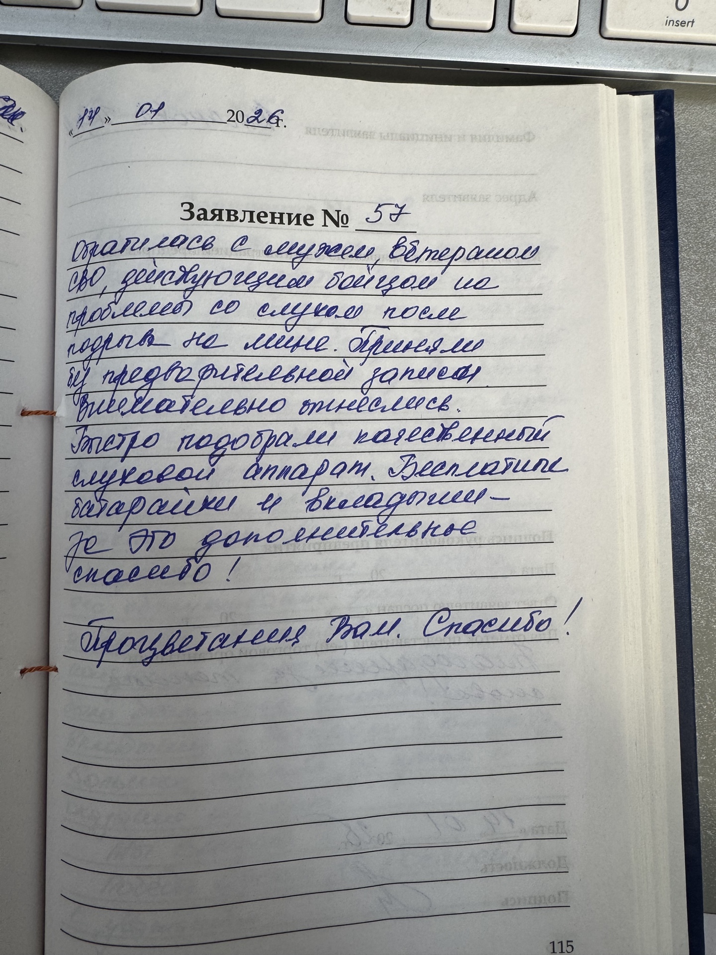 обратился за помощью по подбору слухового аппарата. являюсь действующим военнослужащим, участником СВО. Приняли без предварительной записи, внимательно провели диагностику, предложили несколько вариантов решения проблемы. Обслуживание во время приема оказывалось с уважением, профессионально. правила пользования слуховым аппаратом объяснили полностью, его обслуживание и эксплуатацию , а также в дальнейшем настройку. кроме того предложено было бесплатное изготовление вкладыша и батарейки к аппарату. Большое спасибо за прием и оказание помощи. Мы вместе. победа будет за Россией!с уважением.