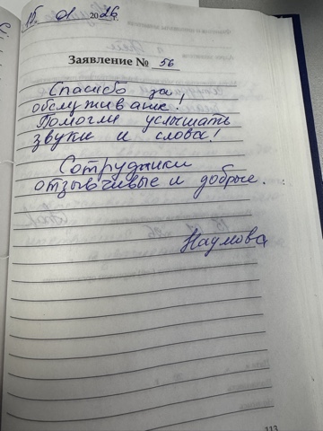 Спасибо за обслуживание! Помогли услышать звуки и слова! Сотрудники отзывчивые и добрые.