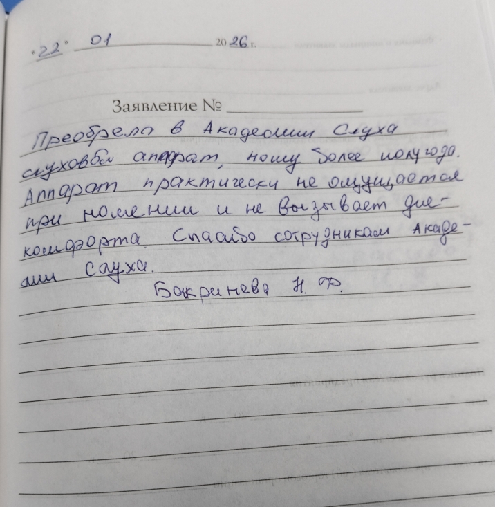 Приобрела в Академии Слуха слуховой аппарат, ношу более полугода. Аппарат практически не ощущается при ношении и не вызывает дискомфорта. Спасибо сотрудникам Академии слуха.