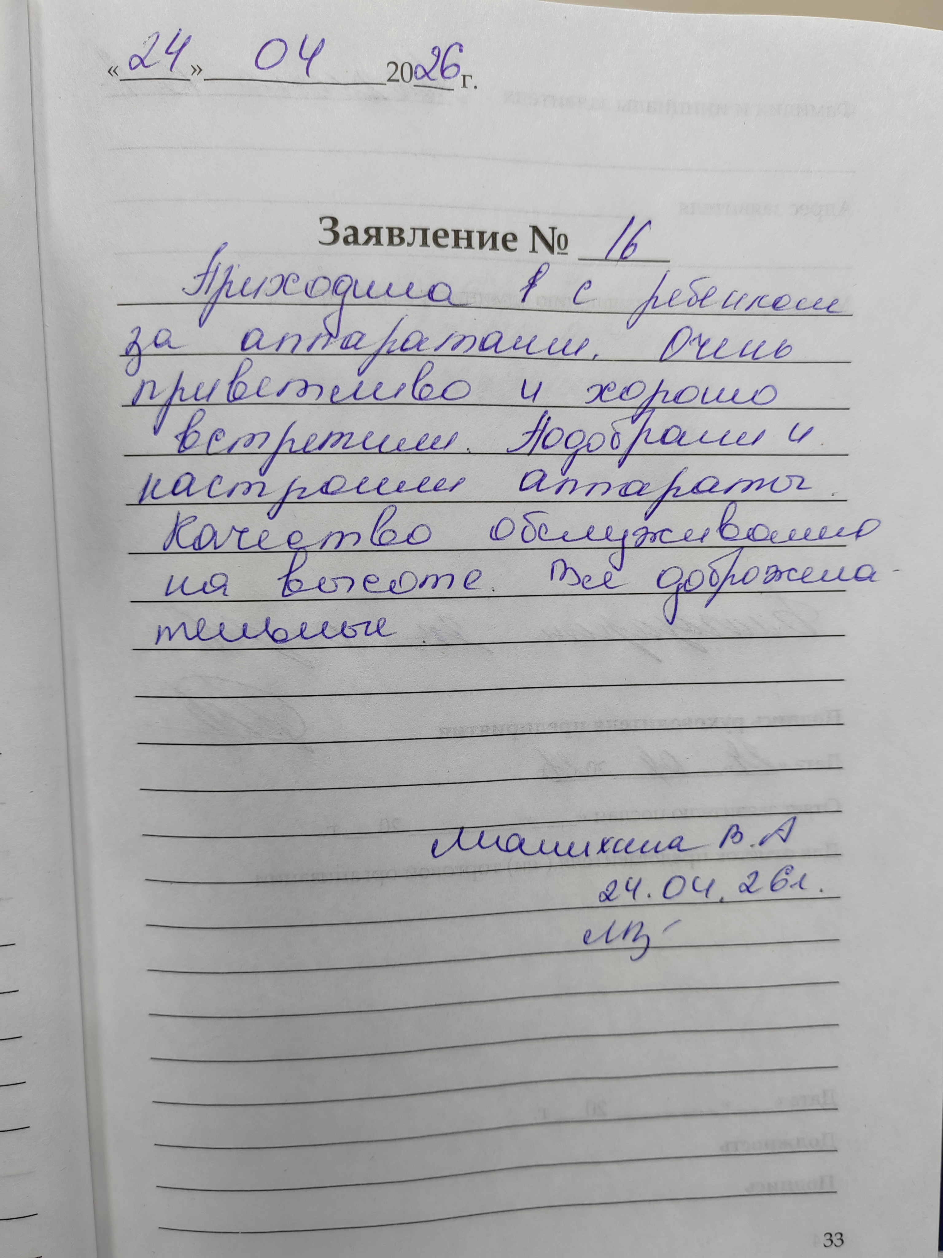 Приходила с ребенком за аппаратами. Очень приветливо и хорошо встретили. Подобрали и настроили аппараты. Качество обслуживания на высоте. Все доброжелательные.