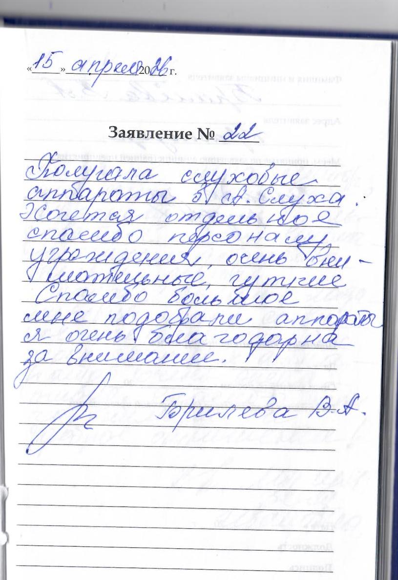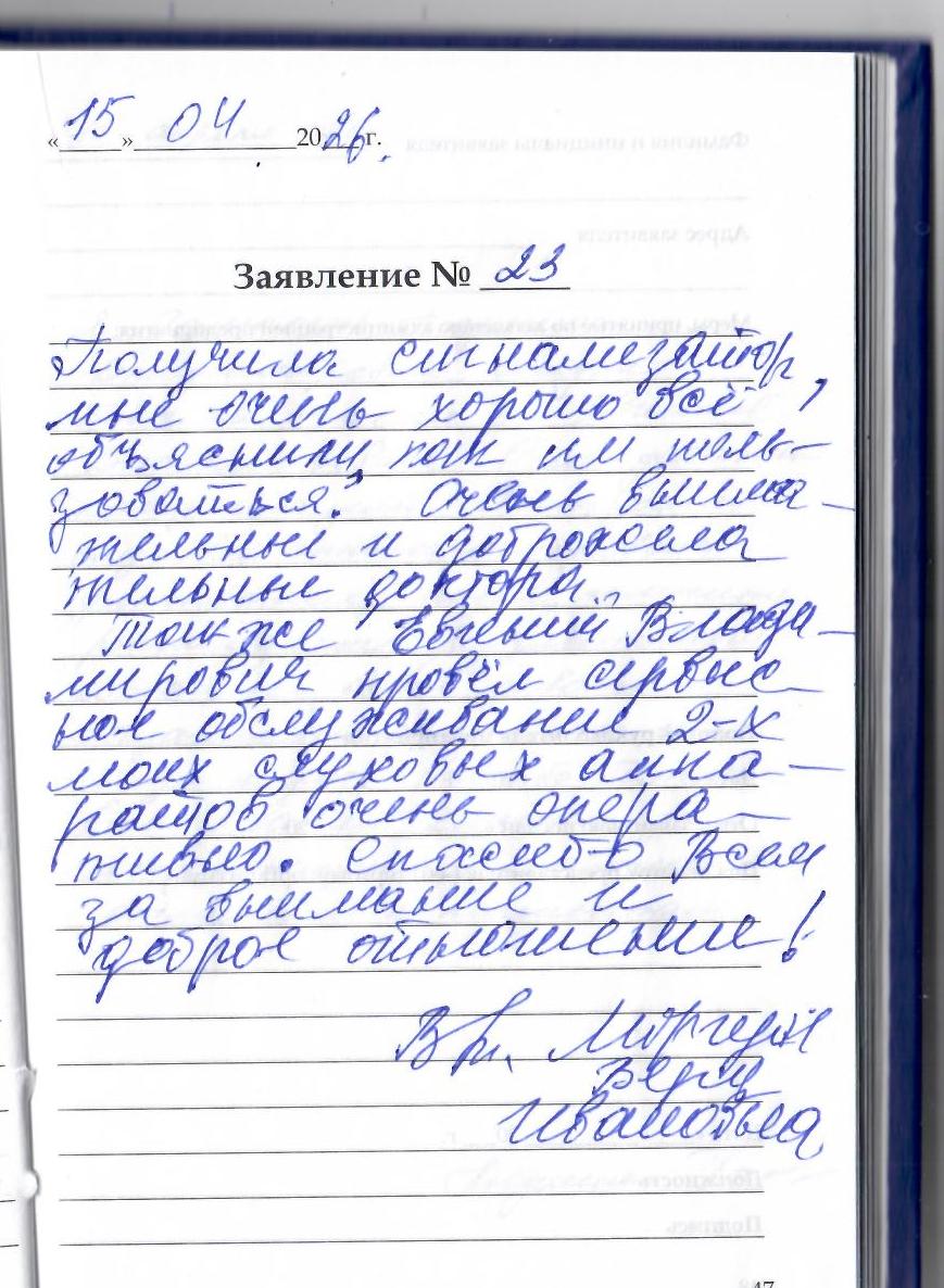Получила сигнализатор, мне очень хорошо все объяснили как им пользоваться. Очень внимательные и доброжелательные доктора. Также Евгений Владимирович провел сервисное обслуживание 2-х моих слуховых аппаратов очень оперативно. Спасибо всем за внимание и доброе отношение! Моргун В.А.