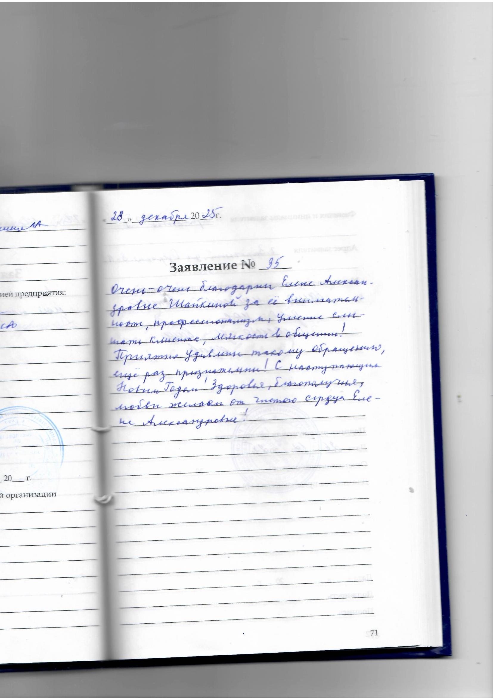 Очень -очень благодарна Елене Александровне Шайкиной за ее внимательность, профессионализм, умение слушать клиента и мягкость в общении!Приятно удивлена такому общению, еще раз признательна! С наступающим новым годом! Здоровья, благополучия, любви желаю от всего чистого сердца Елене Александровне!