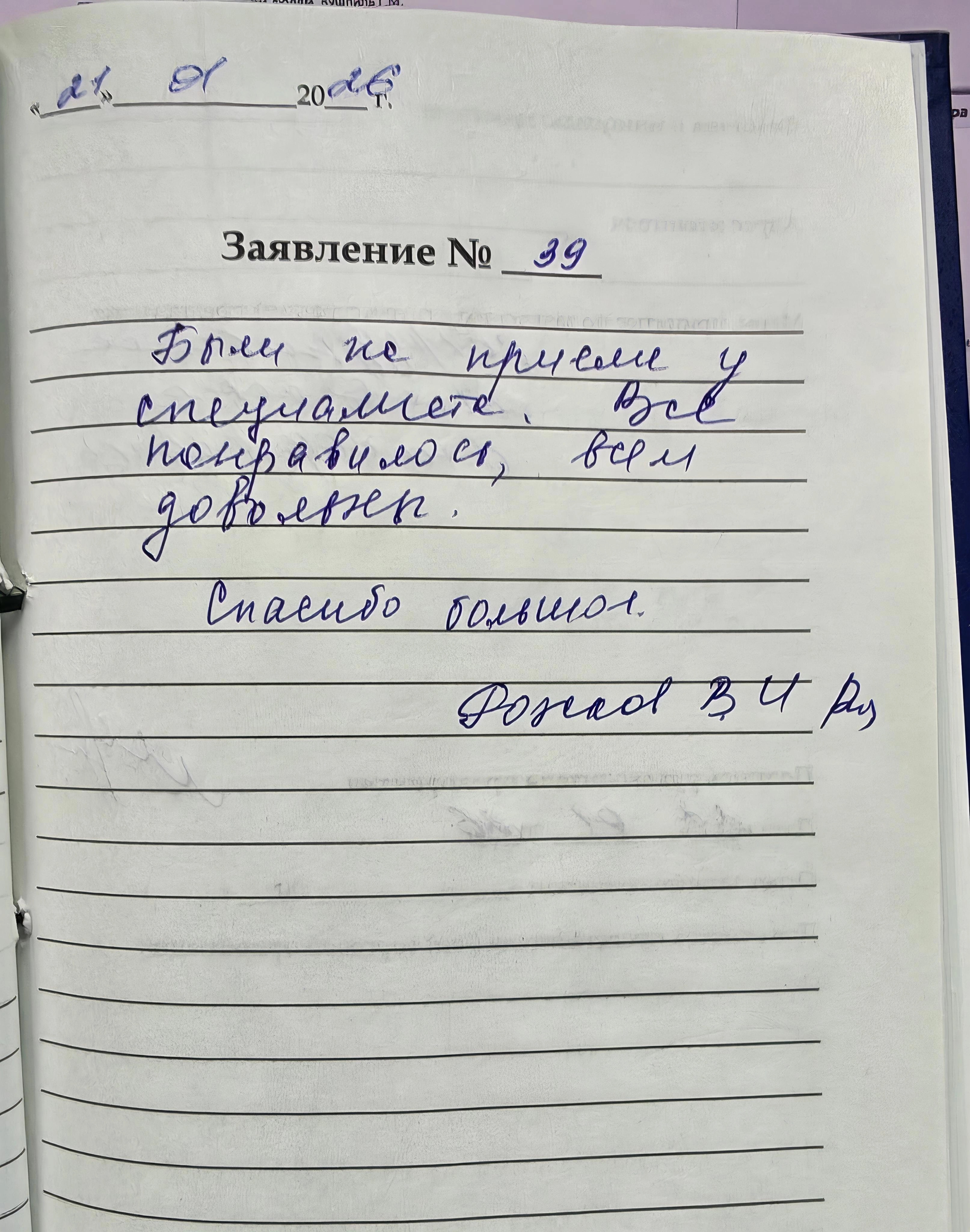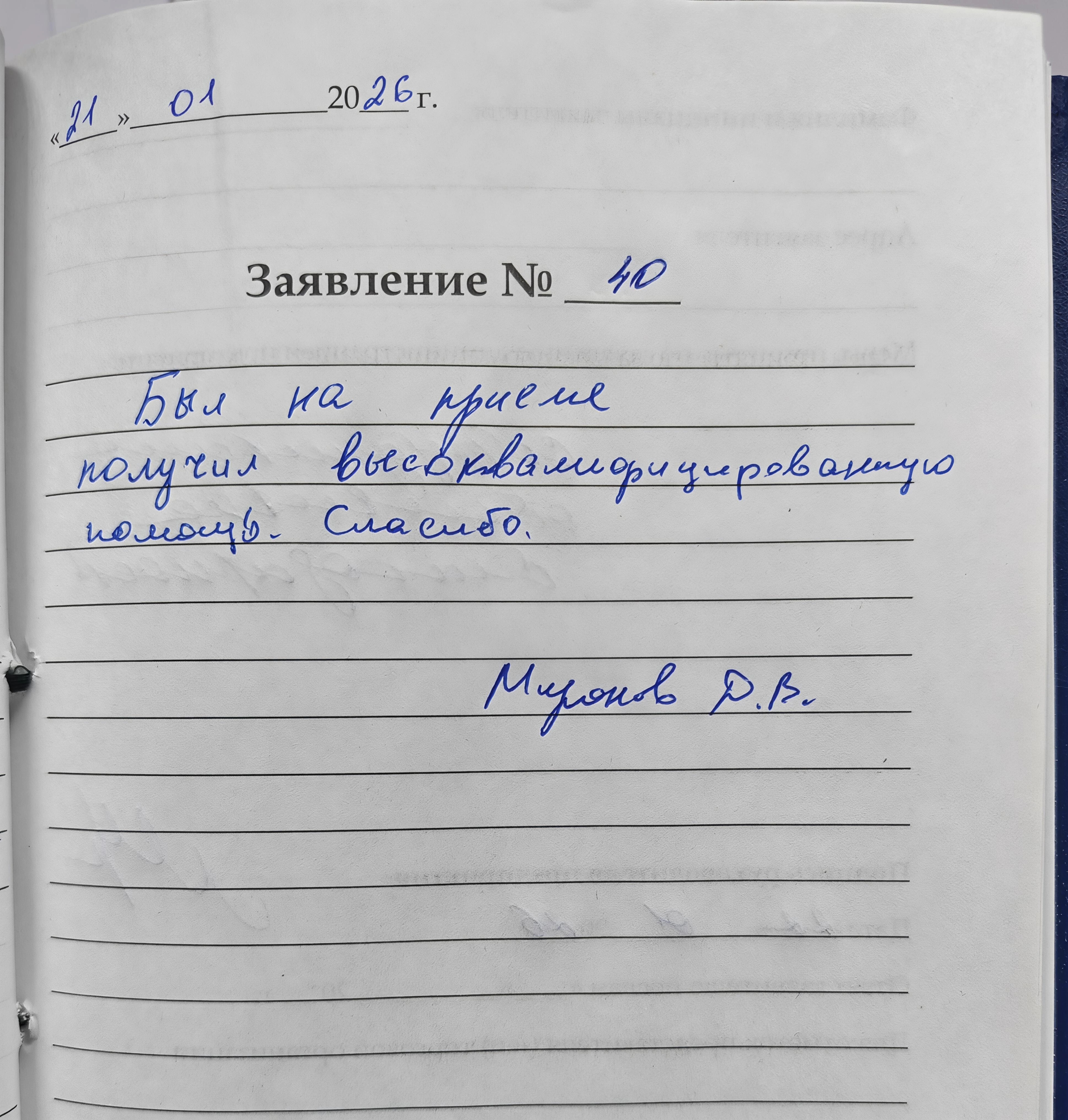 Был на приеме приёме получил высококвалифицированную помощь. Спасибо! Миронов Д.В.