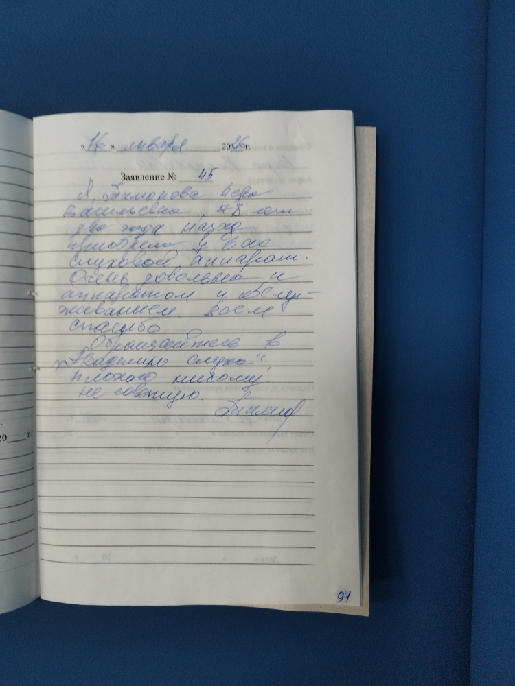 Я, Тимонова Вера Васильевна, 78 лет. Два года назад приобрела у вас слуховой аппарат. Очень довольна и аппаратом и обслуживанием. Всем спасибо. Обращайтесь в "Академию слуха" плохого никому не советую.