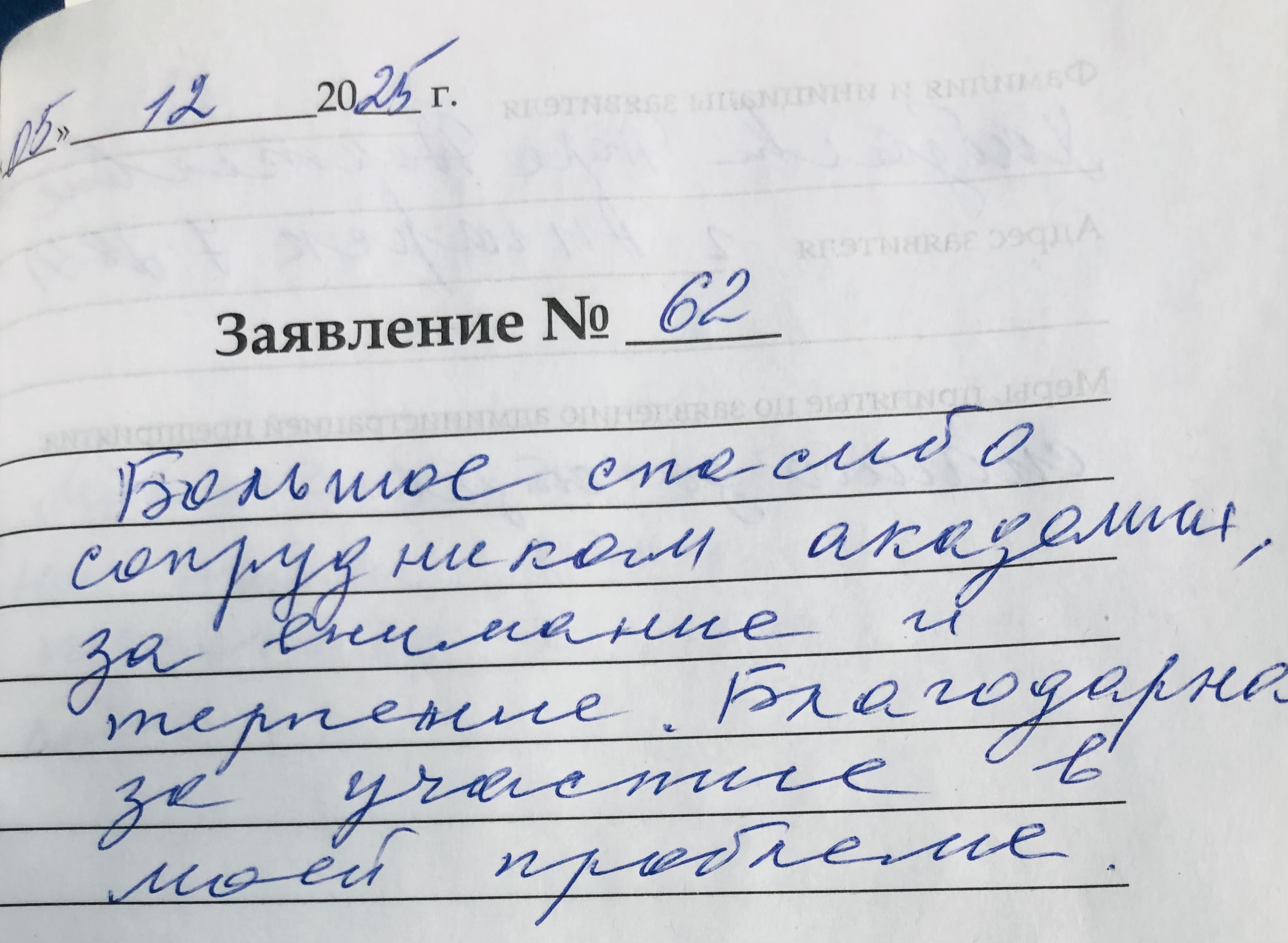 Большое спасибо сотрудникам академии, за внимание и терпение. Благодарна за участие в моей проблеме.