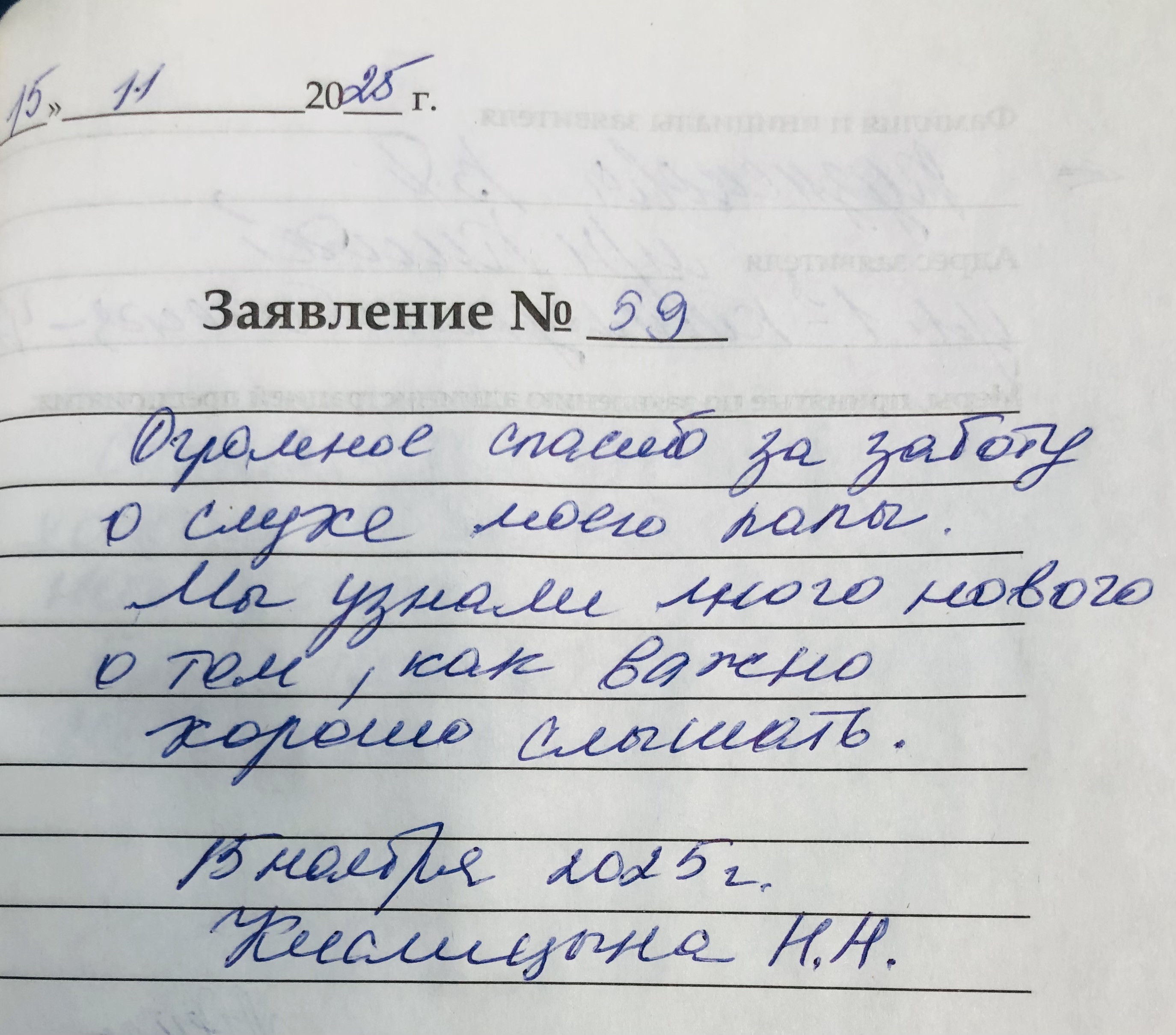 Я Искандаров ИАО выражаю большое благодарность работникам за подбор слухового аппарата и настройке, а так же внимательного объяснения по их применению а так же ухода за аппаратом. Поздравляю всех сотрудников с наступающим с новым 1926 годом. Желаю крепкого здоровья семейного благополучия и успехов в дальнейшем трудового достижения. Искандаров ИА