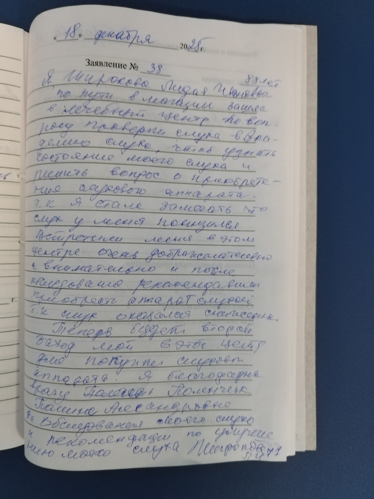 Я, Широкова Лидия Ивановна по пути в магазин зашла в лечебный центр по вопросу проверки слуха в Академию слуха, чтобы узнать состояние моего слуха и решить вопрос о приобретении слухового аппарата, т.к. я стала замечать, что слух у меня понизился. Встретили меня в этом центре очень доброжелательно и внимательно и после обследования рекомендовали приобрести слуховой аппарат, т.к. слух оказался снижен. Теперь будет второй заход мой в этот центр для покупки слухового аппарата. Я благодарна врачу Оленчик Полине Александровне за обследование моего слуха и рекомендации по улучшению моего слуха.
