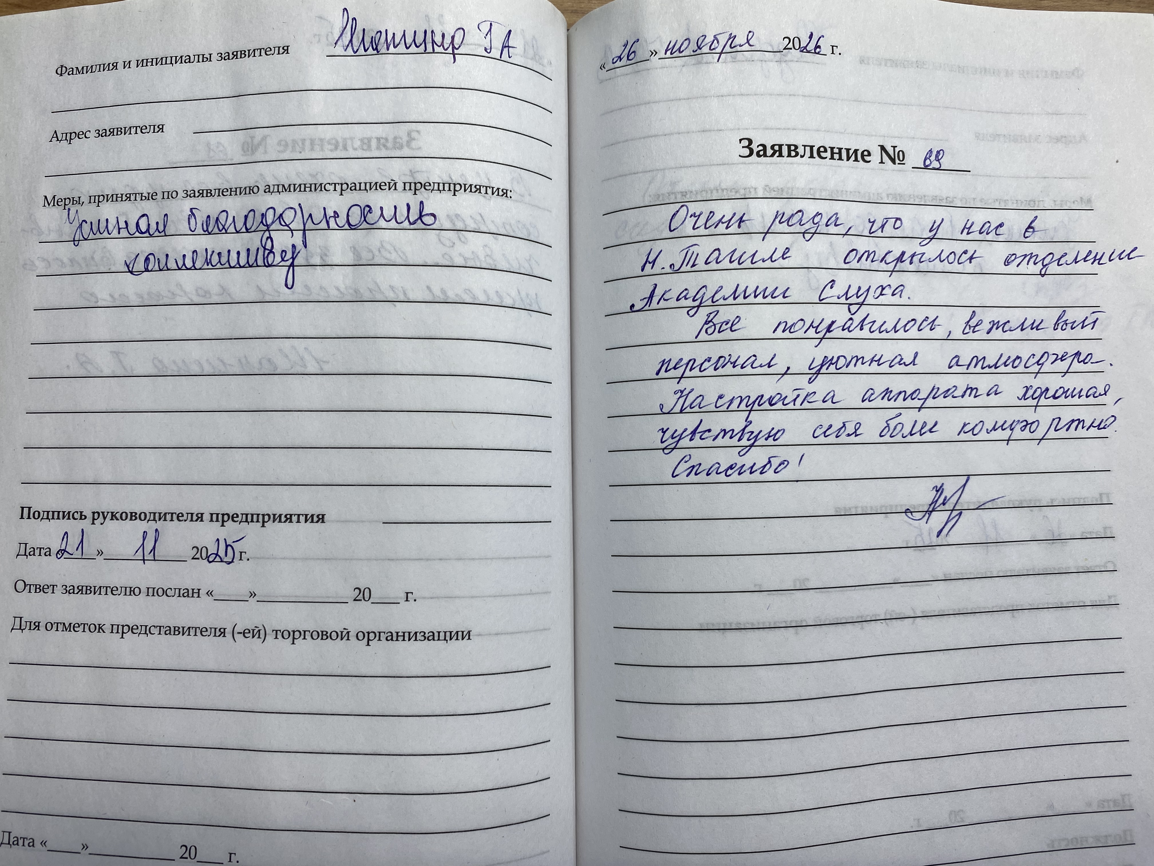 Очень рада, что у нас в Н. Тагиле открылось отделение Академии Слуха. Всё понравилось, вежливый персонал, уютная атмосфера. Настройка аппарата хорошая, чувствую себя более комфортно. Спасибо!